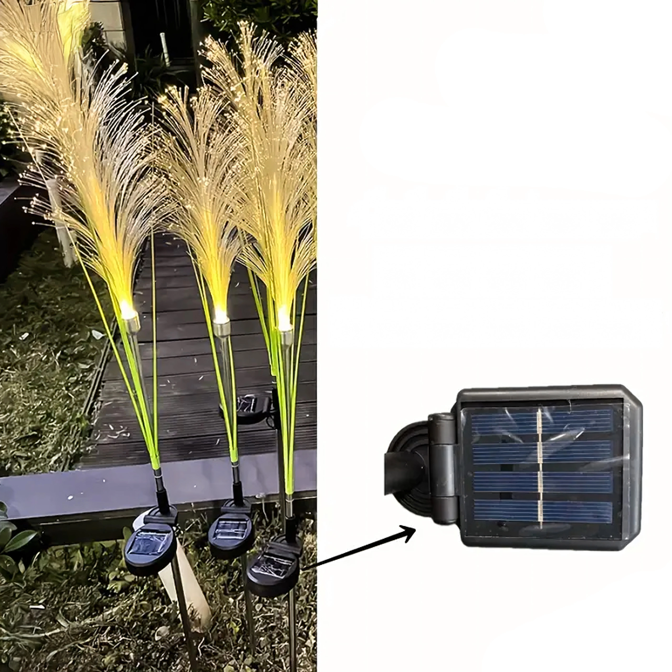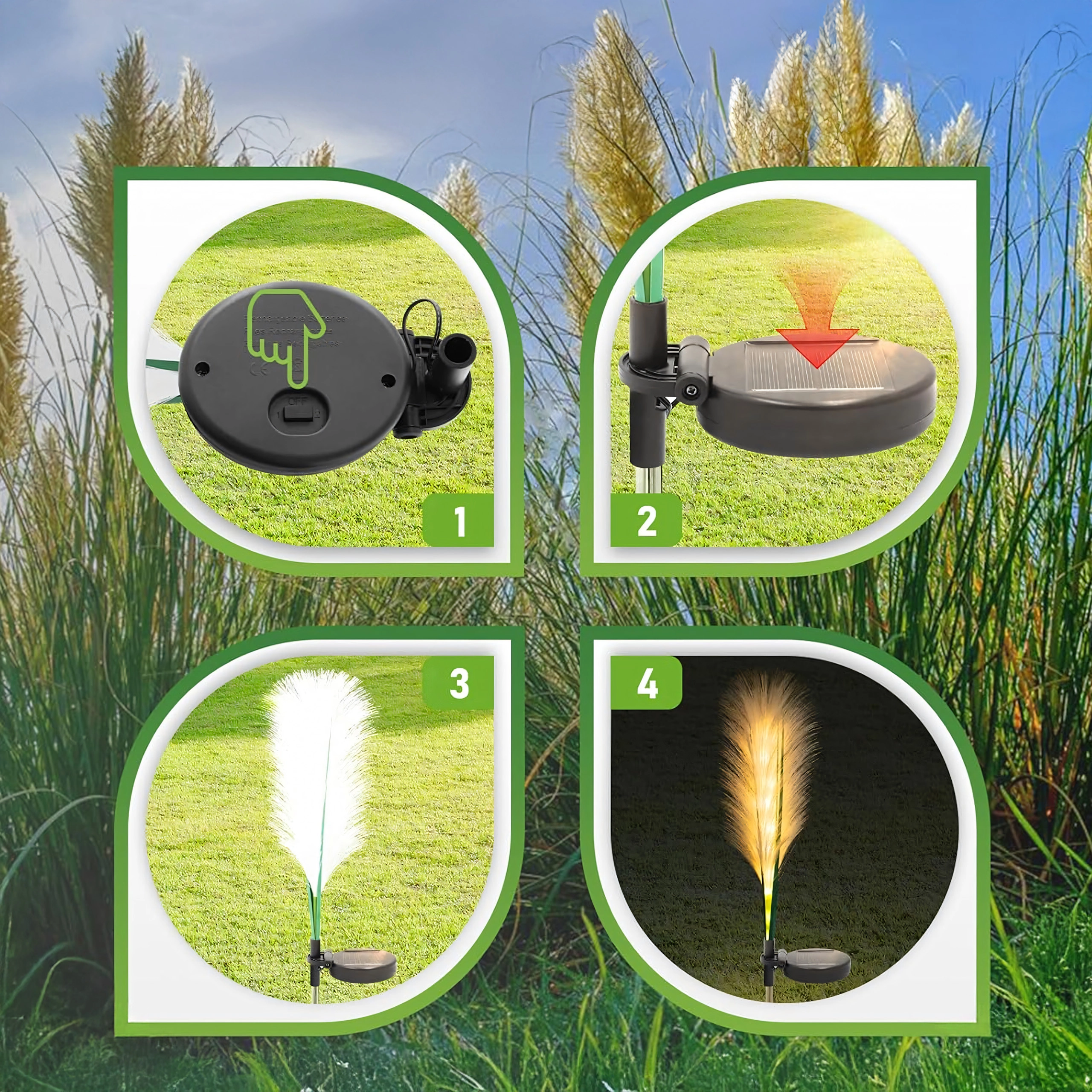 Skab en magisk stemning i haven med solcelledrevne dekorative lys formet som pampasgræs. Elegant, varmt lys, automatisk tænding ved skumring, ingen kabler eller strøm fra nettet og nem installation ved nedstikning i jorden – ideelt langs stier, i bede og på græsplænen.