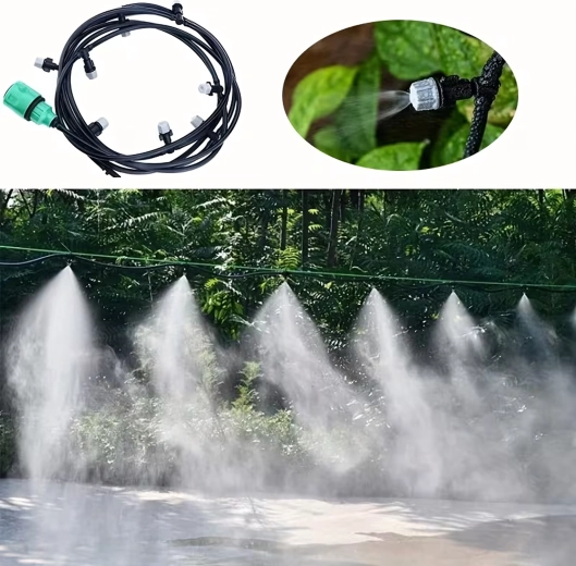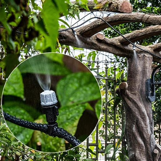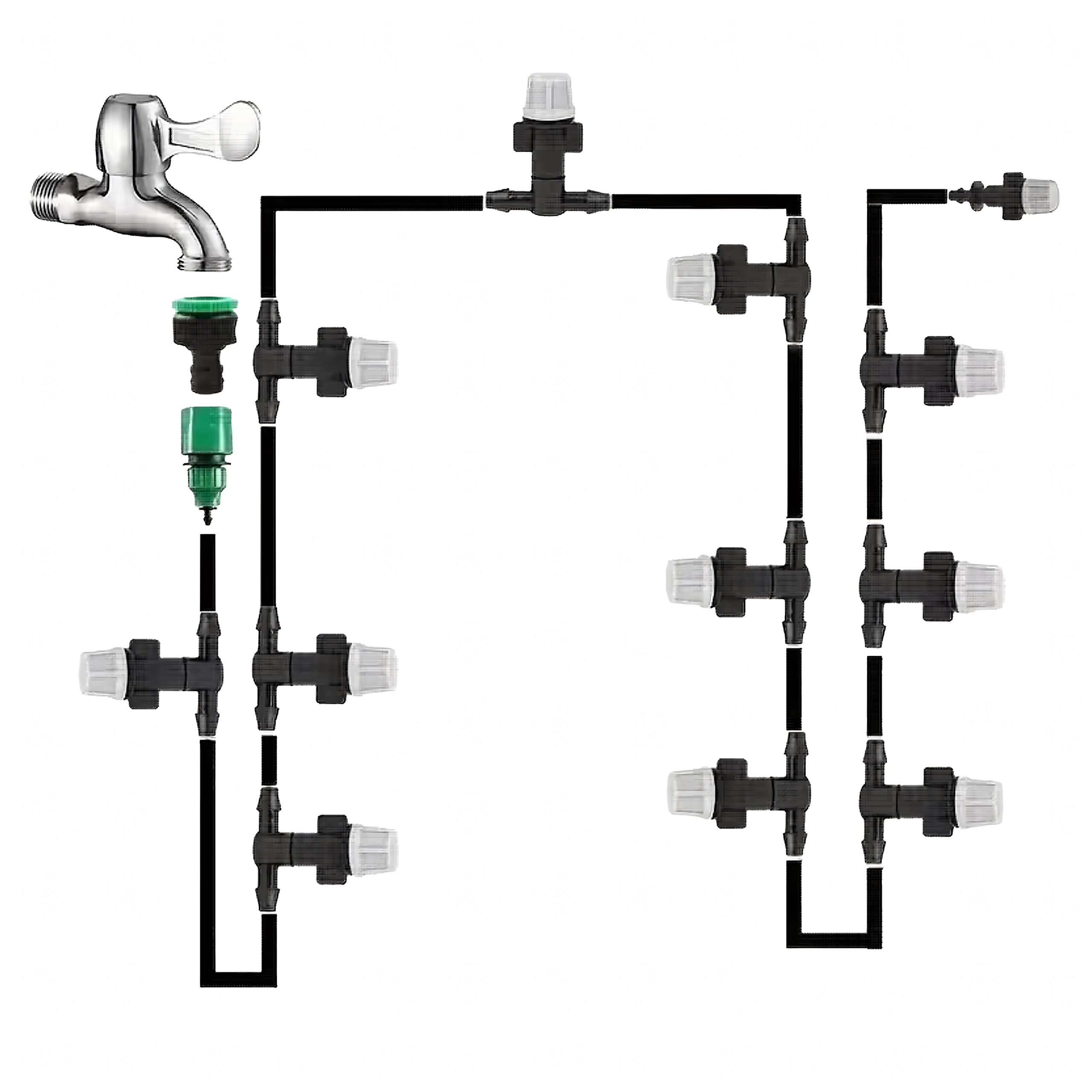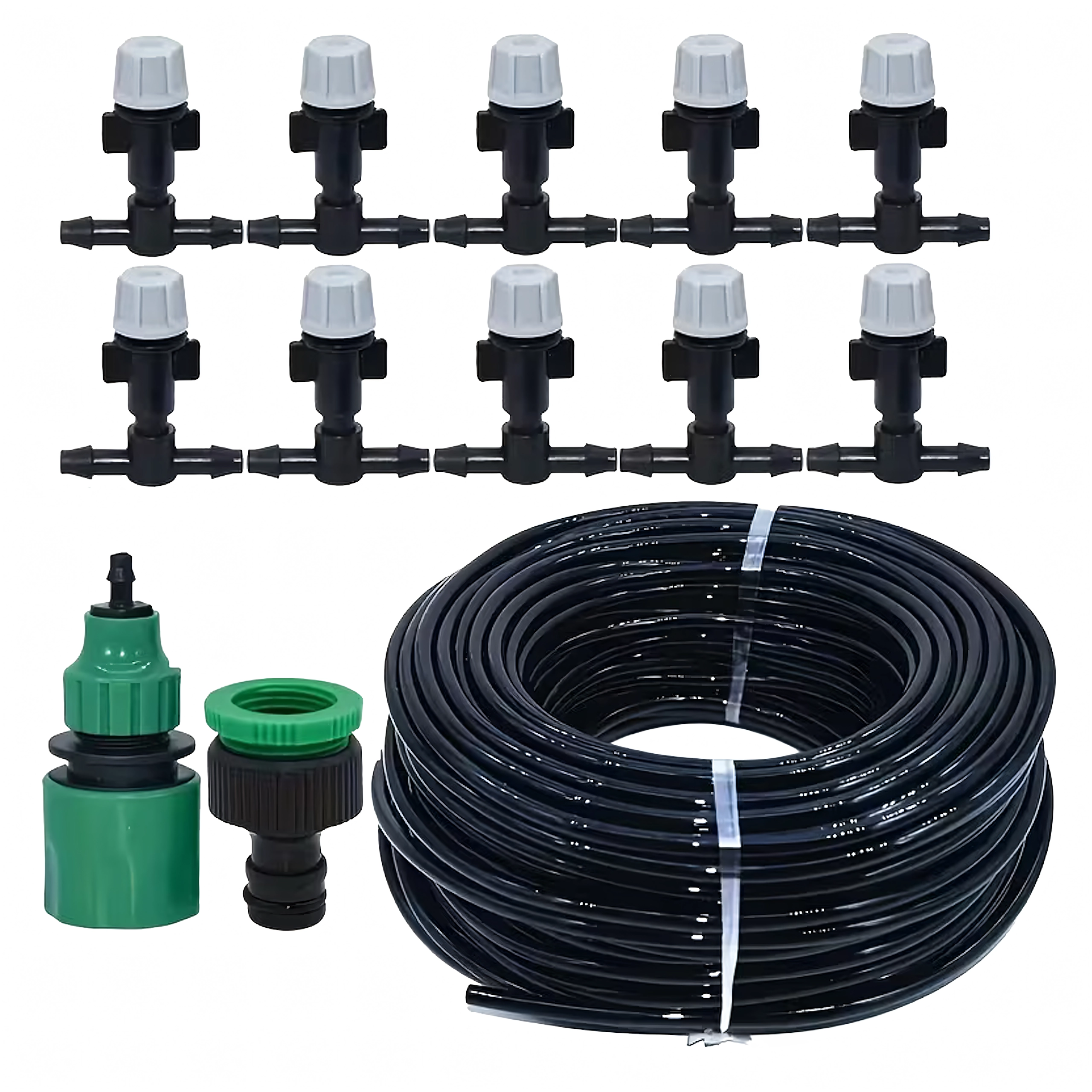 Dette alsidige have-mistsystem giver skånsom og jævn vanding direkte til rødderne og over bladene. Med justerbare dyser kan du skabe en fin kølende tåge til terrasser og drivhuse eller målrettet mikrospray til dyrkningsbede og altankasser. Systemet sikrer stabil vandfordeling til flere punkter og udvides nemt med T-stik.