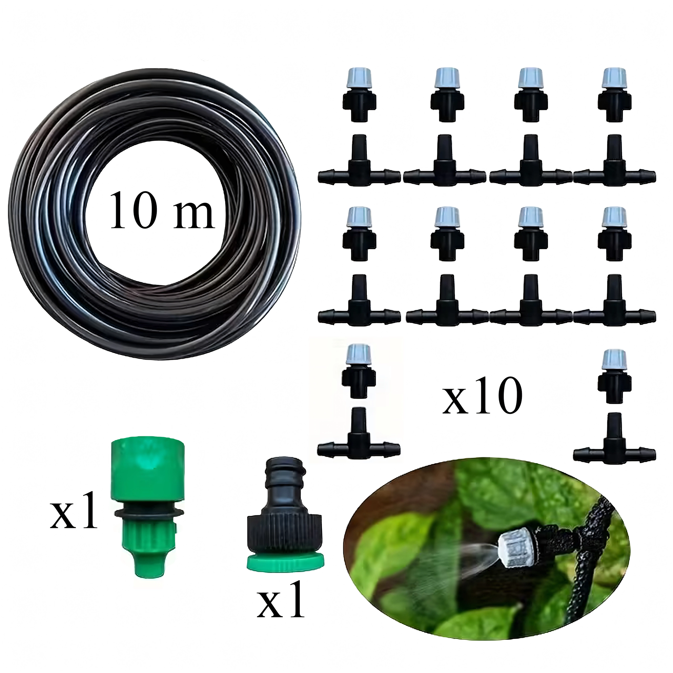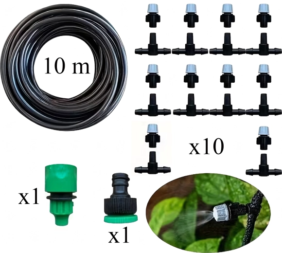Komplet sæt til mistning og drypvanding med en længde på 10 m og 10 justerbare dyser til effektiv vanding af bede, drivhuse og krukker. Muliggør fin tåge til nedkøling og jævn vanding uden vandspild. Nem installation, vandbesparelse og mulighed for tilpasning af retning og intensitet af spray.