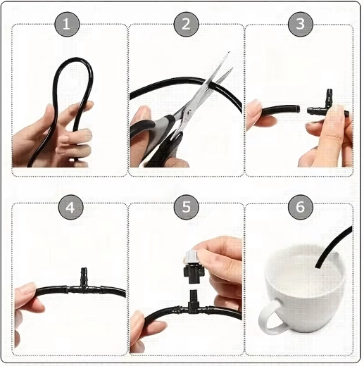 Installationen er hurtig: tilslut slangen via den medfølgende adapter til vandhanen, læg 10 m rørsystem ud, placer dyserne og finjustér retning og intensitet. Holdbare materialer er velegnede til udendørs brug, mens justerbare emittere minimerer vandforbrug og forhindrer overvanding.