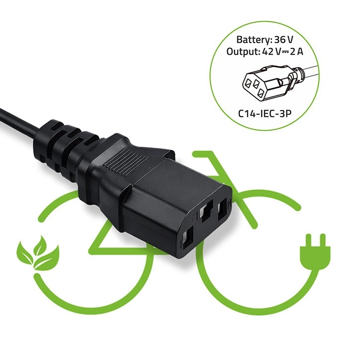 Oplader til elcykler 36 V, 42 V, 2 A med C14 IEC 3‑pin stik + strømkabel