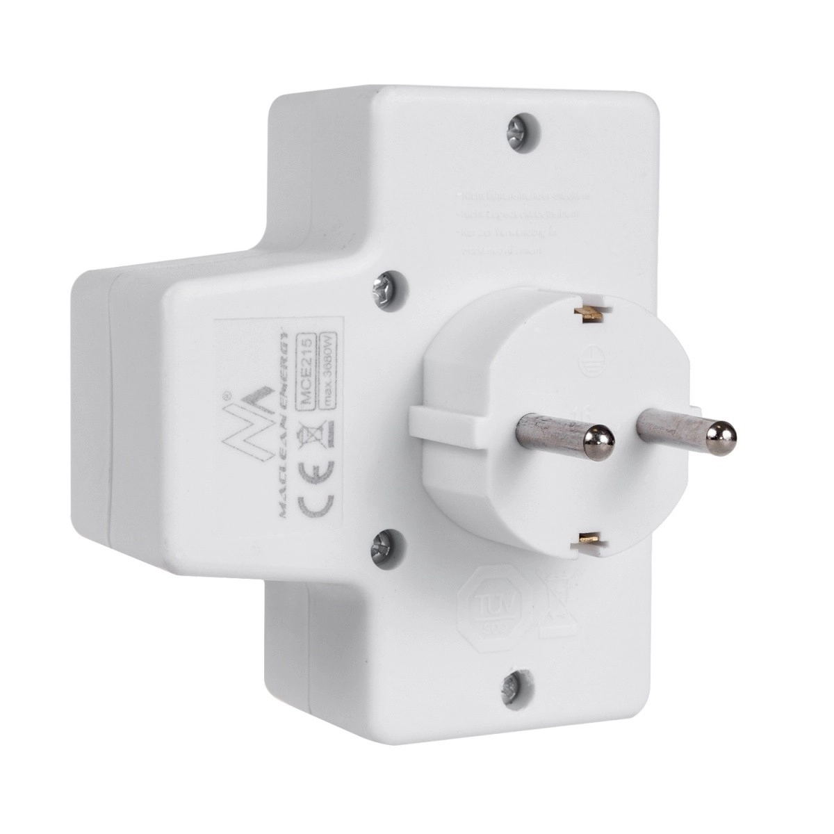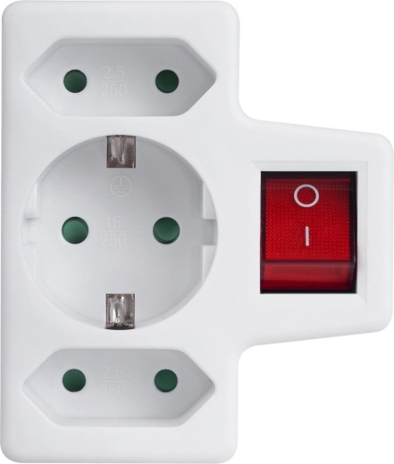Praktisk stikdåseadapter med én Schuko 16 A udgang og to Euro 2,5 A gør det muligt at tilslutte flere apparater samtidig uden forlængerledninger. Den integrerede afbryder sparer energi ved at slukke alle tilsluttede enheder med ét tryk, og børnesikring øger sikkerheden i hjemmet.