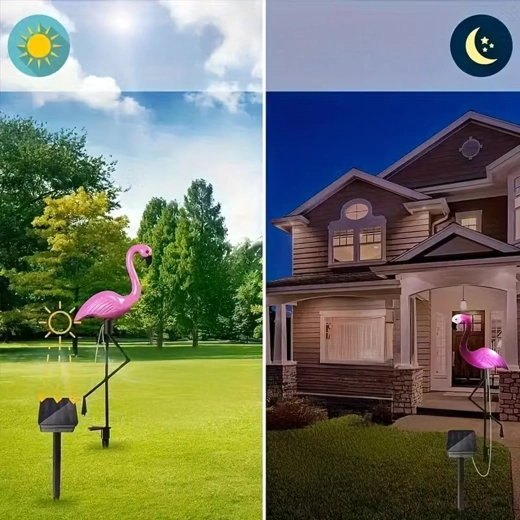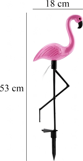 Giv din have et stilfuldt løft – en solcelledrevet LED-lampe i form af en flamingo, 53 cm høj. Den tilbyder automatisk natbelysning, nem nedstikning i jorden og vejrbestandighed. Ideel til stier, bede og terrasser.