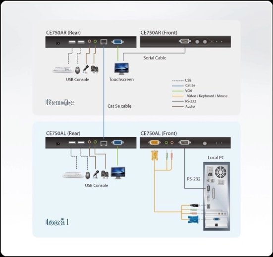 Den integrerede RS-232-port på både lokal og fjern enhed muliggør serielforbindelse og tilslutning af enheder som touchskærme og stregkodelæsere. Løsningen er ideel til industrielle miljøer, produktionshaller eller byggepladser, hvor du har brug for konsollen ved hånden og computeren i et beskyttet område.