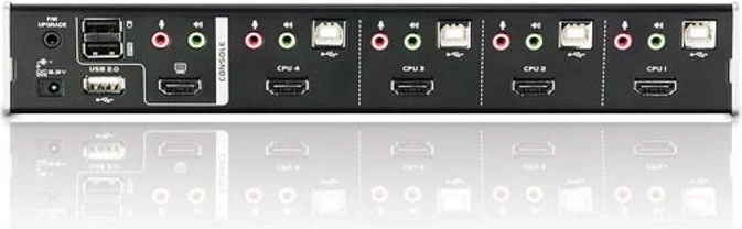Professionel KVM-switch til 4 computere med HDMI og USB 2.0 lader dig styre alt fra én enkelt konsol. Tilbyder uafhængig switching af video, USB-periferi og lyd, understøttelse af Full HD 1080p / 1920 × 1200, HDCP og førsteklasses lyd Dolby TrueHD / DTS‑HD Master Audio. Takket være den indbyggede 2-ports USB 2.0‑hub tilslutter du nemt tastatur, mus og andre enheder.