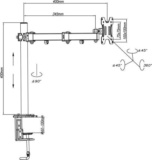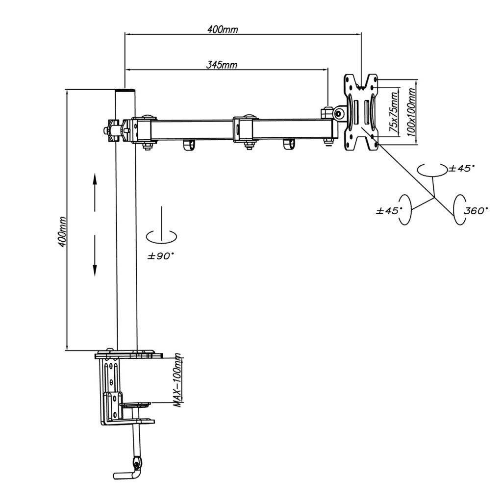 Beslaget understøtter tilt i området -45° til +45° og rotation -90° til +90°, så du nemt kan tilpasse visningen til den aktuelle opgave. Den integrerede skjulte kabelhåndtering holder arbejdsfladen ren og overskuelig.