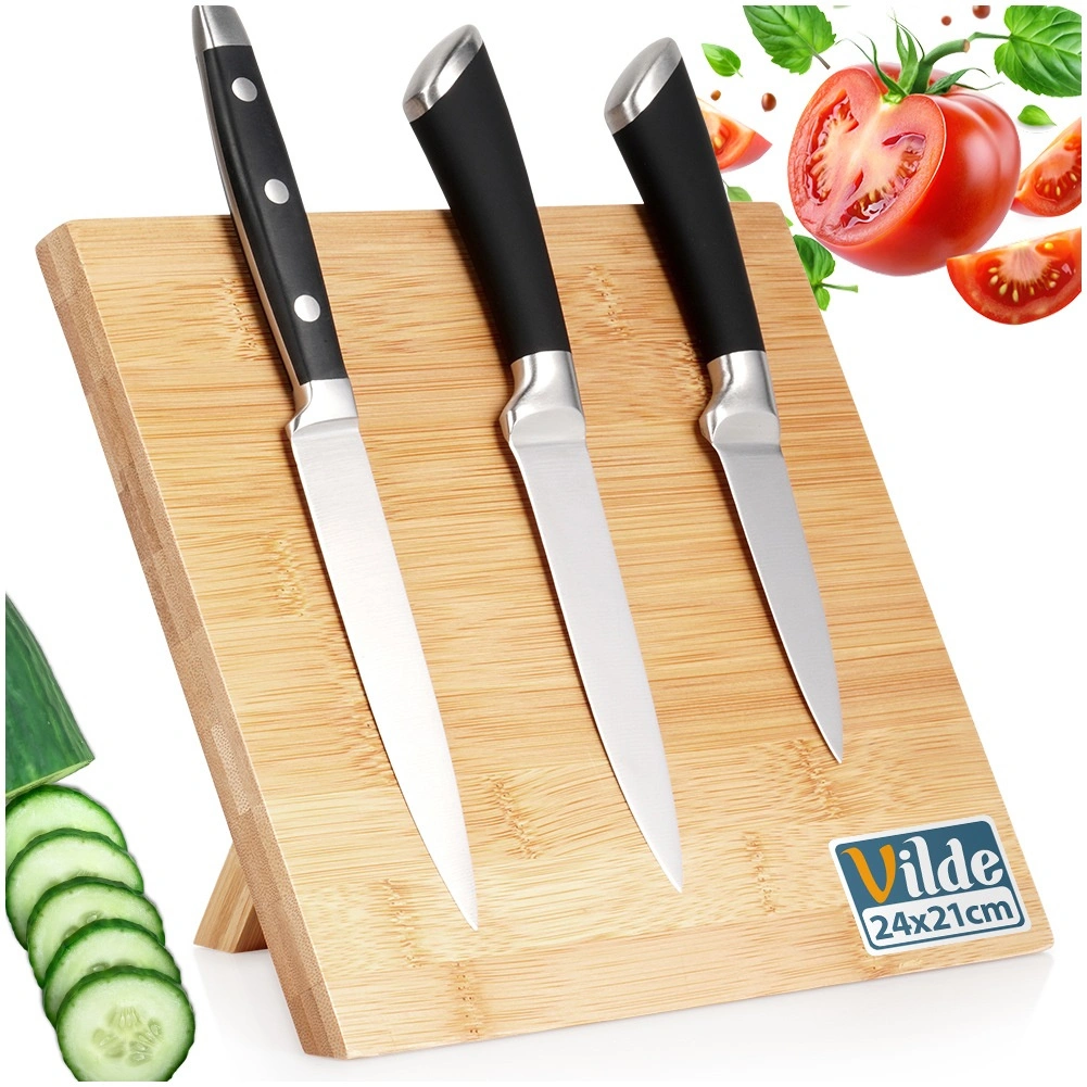 Den magnetiske knivholder i naturlig bambus er et praktisk og dekorativt tilbehør til ethvert køkken. Takket være de indbyggede stærke magneter er det nok blot at sætte knivene på plads – uden at skubbe dem ind i sprækker, hvilket minimerer kontakt for knivæggen med overflader og forlænger dens levetid.