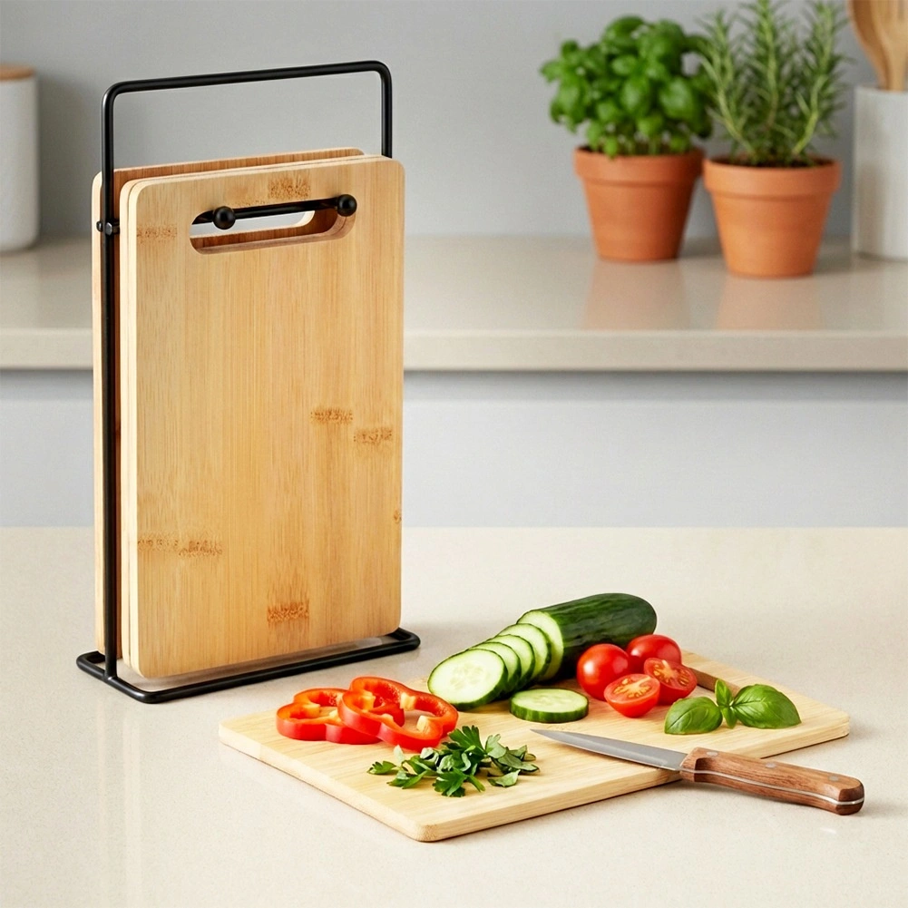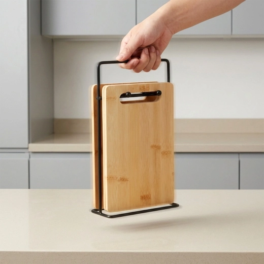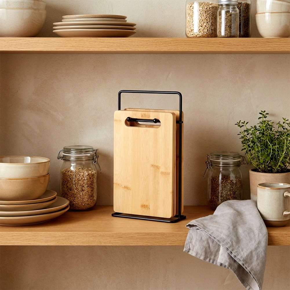 Det sorte metalstativ holder brætterne oprejst, sparer plads på køkkenbordet og sikrer overskuelig opbevaring og hurtig tørring.