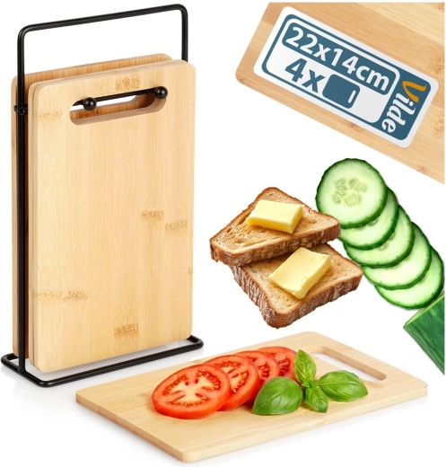 Brætterne 22 × 14 × 0,7 cm ligger godt i hånden og er ideelle til grøntsager, frugt, brød og mindre portioner kød. Stativet holder det hele samlet.