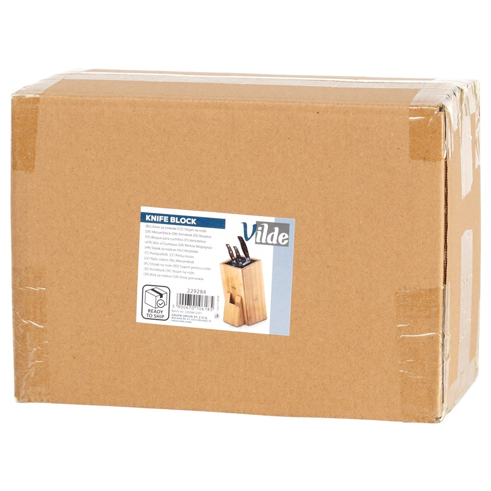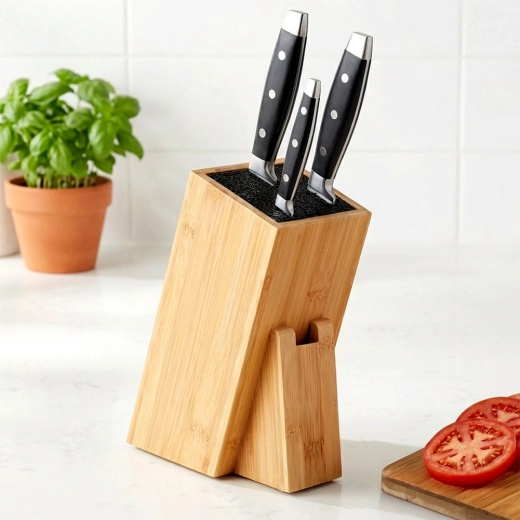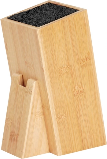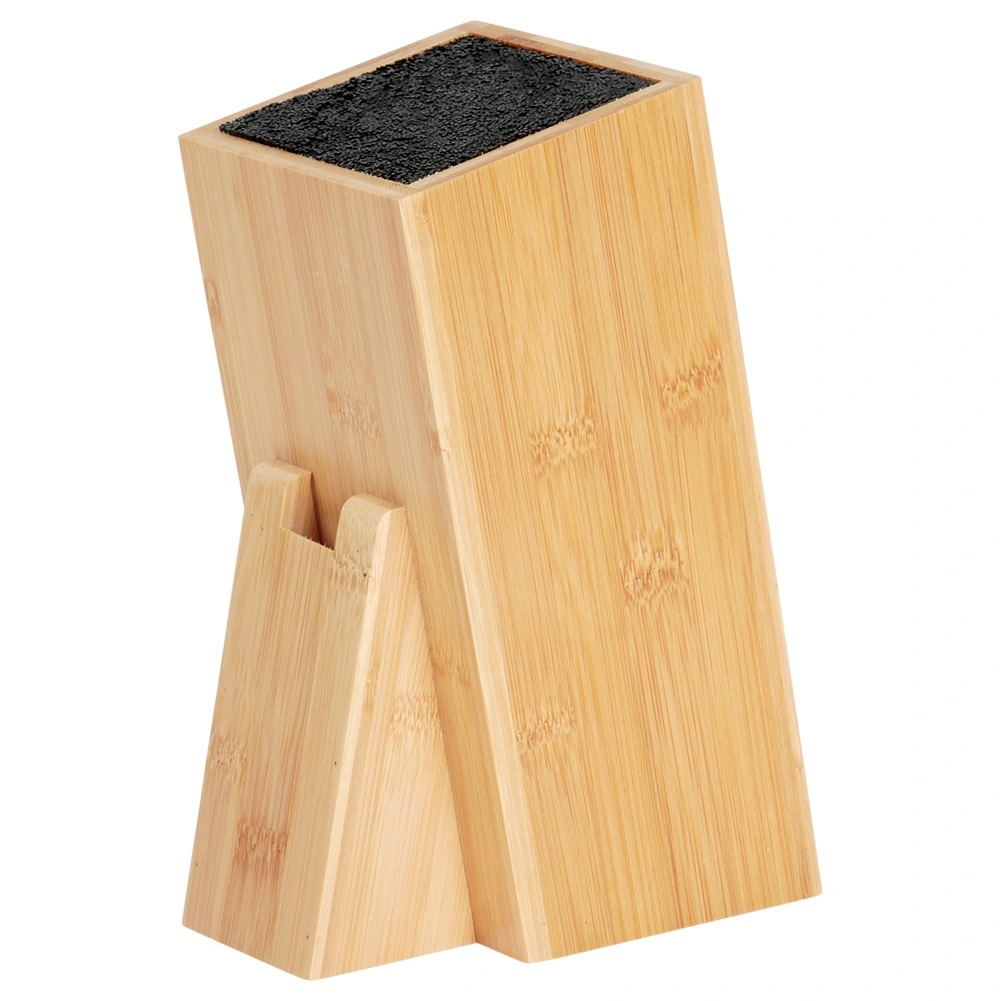 Universel stander til knive og køkkenredskaber i kvalitets bambustræ kombinerer naturligt udseende, stabilitet og praktisk opbevaringsløsning. Den tætte udtagelige fiber indeni blokken tilpasser sig enhver klinge, holder den sikkert på plads og beskytter æggen mod at blive sløv. Det skrå design sikrer nem ind- og udtagning af knive.