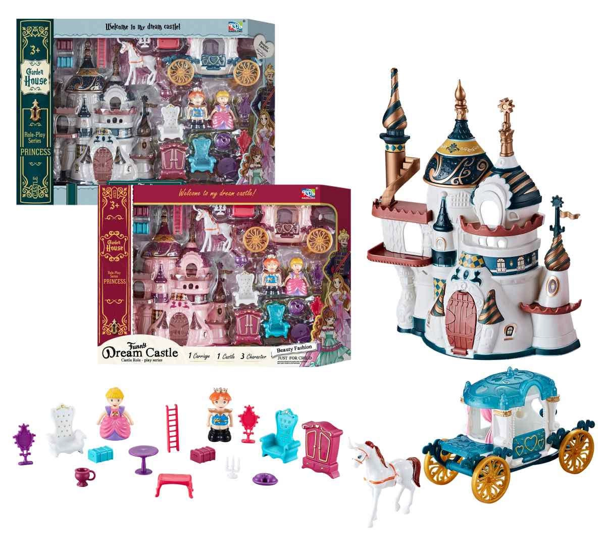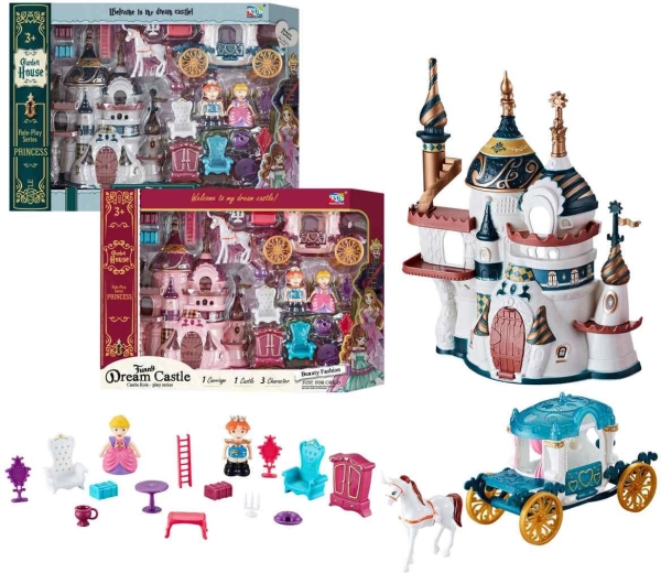 Pakken indeholder et slot, en karet, to figurer og møbler. Produktet fås i to farver, som kan vælges efter barnets præferencer. Med målene 18,5 × 21,5 cm er det ideelt til både leg derhjemme og på farten.