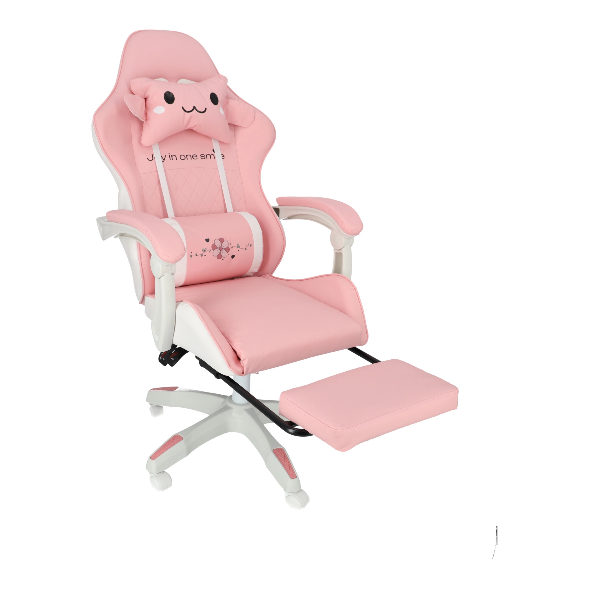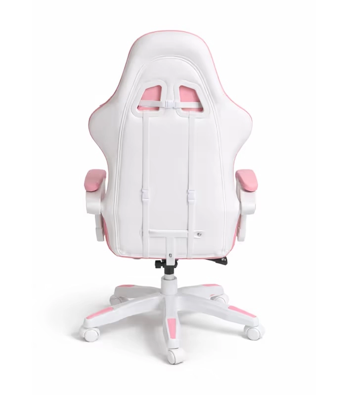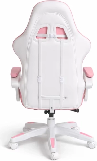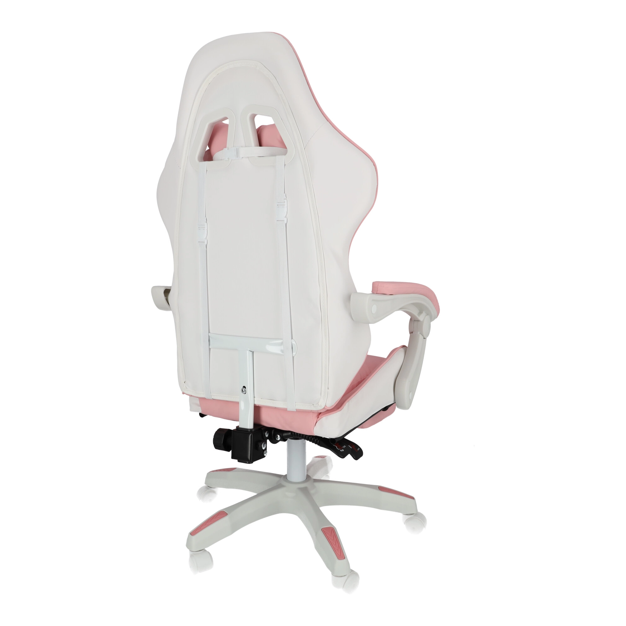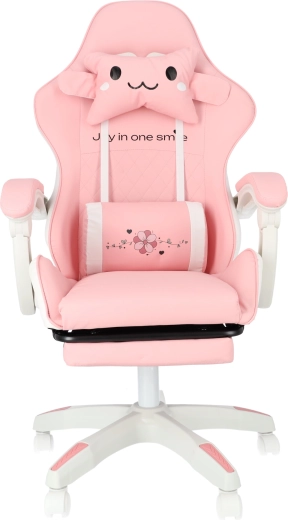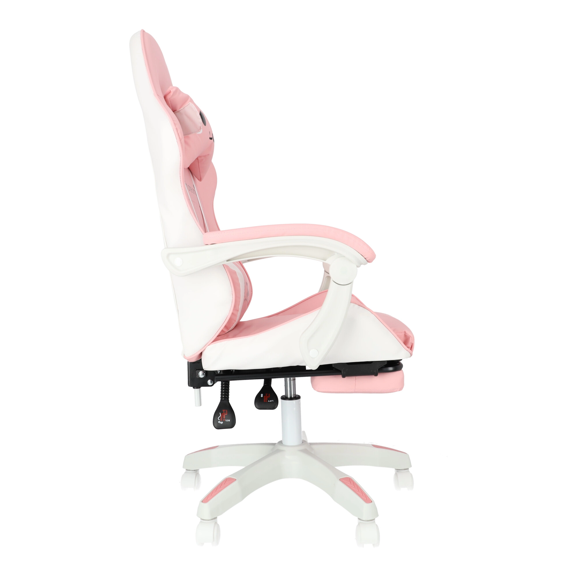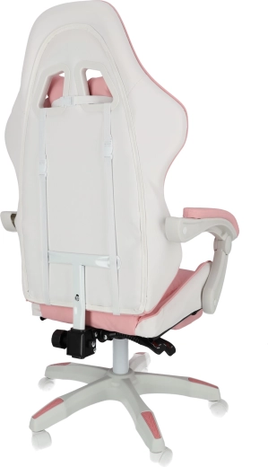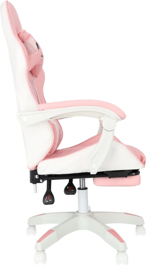 Komforten øges af polstrede armlæn og en udtrækkelig fodstøtte, der på et øjeblik forvandler arbejdspositionen til afslapning. Den robuste base med 360° drejemekanisme og hjul gør det nemt at bevæge sig rundt i rummet. Det stilfulde lyserød-hvide design passer til moderne børne- og ungdomsværelser.