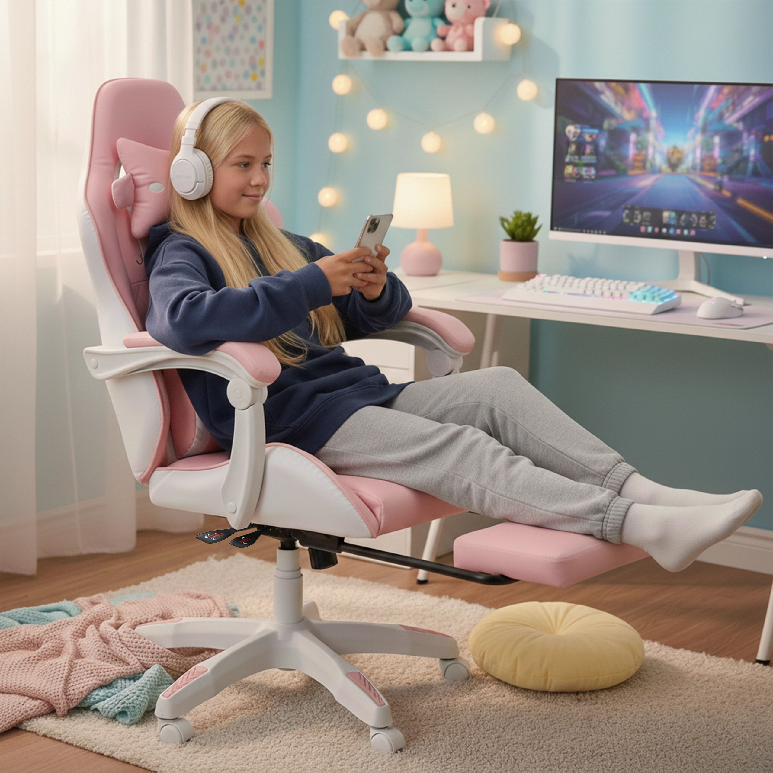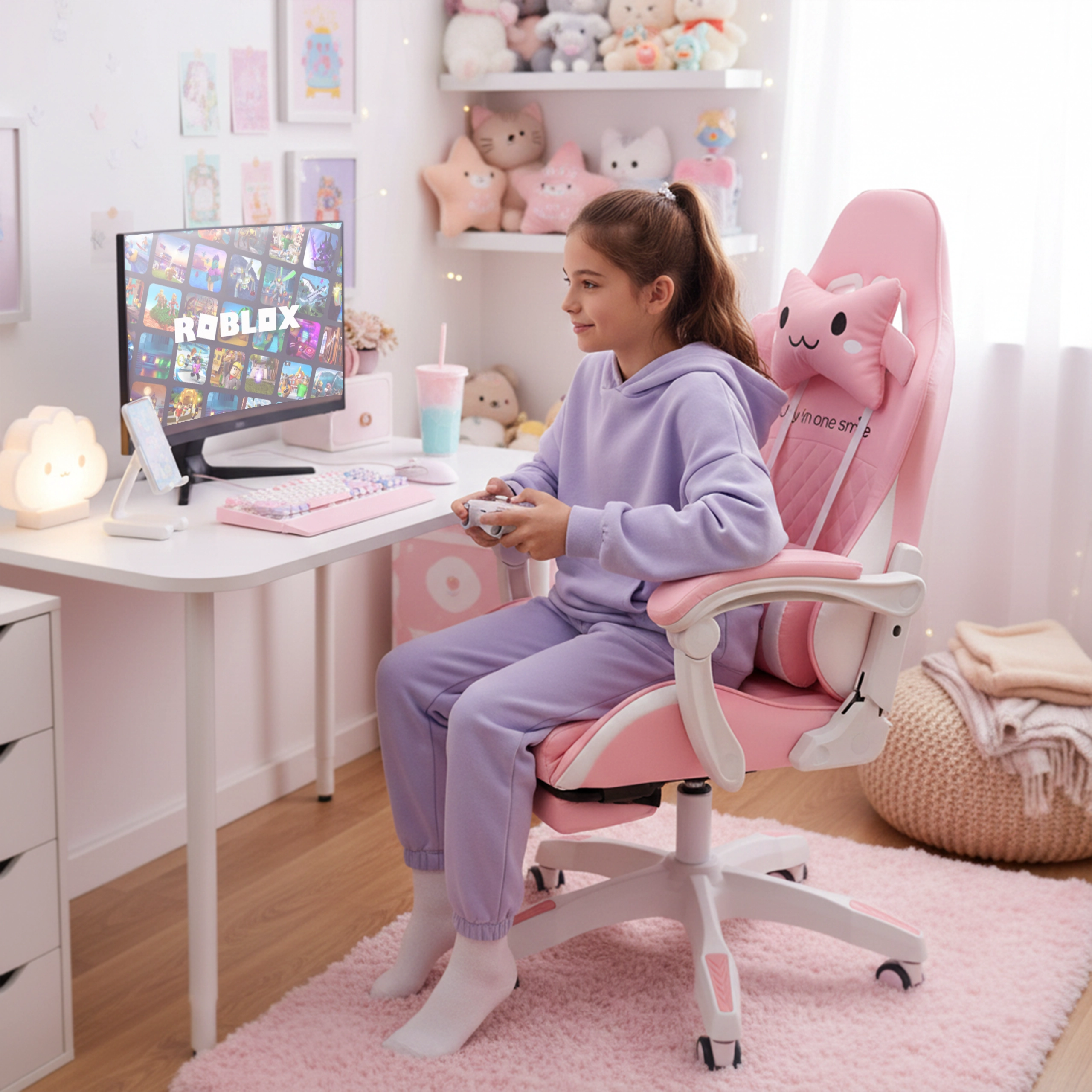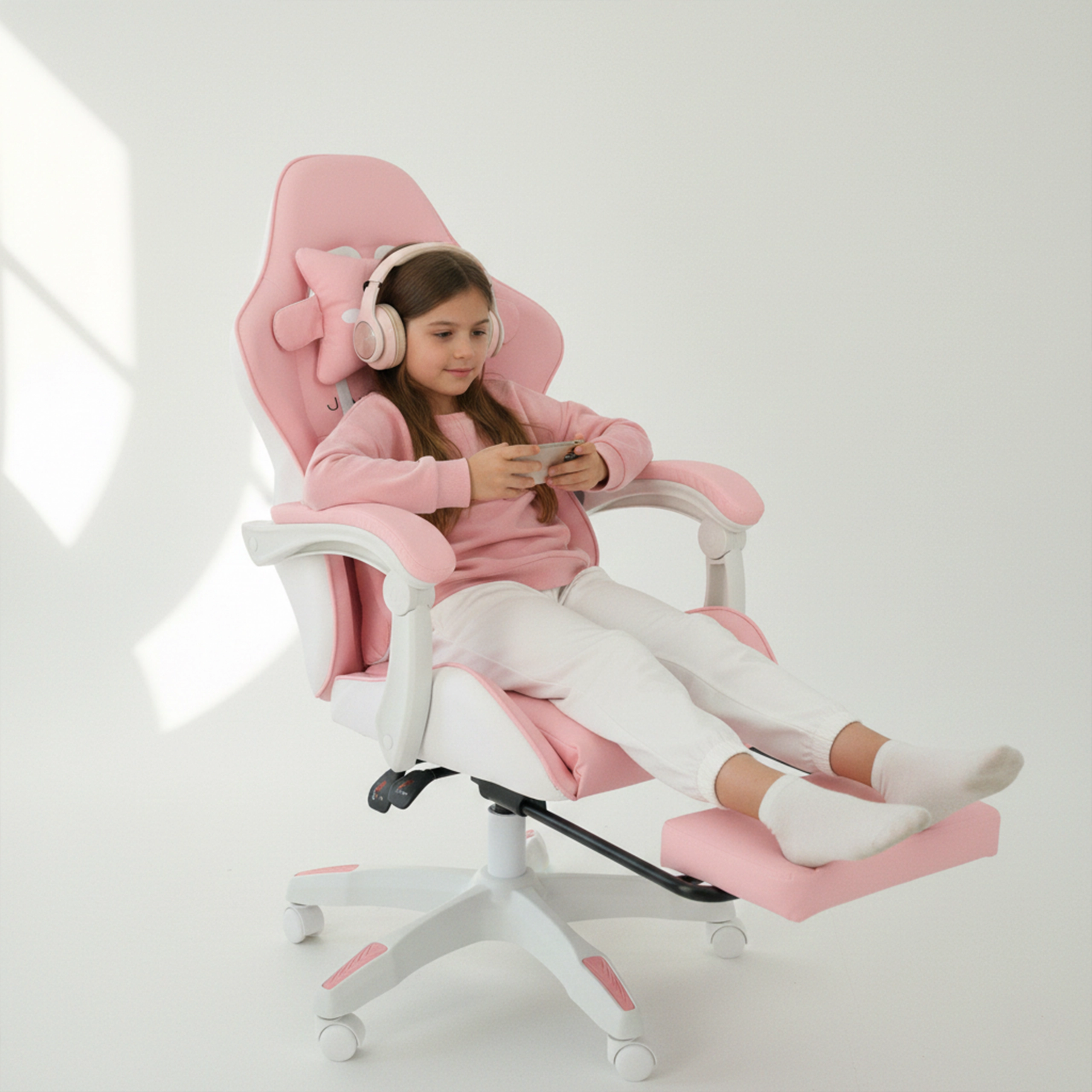Den lyserøde børne gaming- og kontorstol kombinerer ergonomisk komfort, justerbar højde og en udtrækkelig fodstøtte til hurtig afslapning. Skålformet sæde med stabil rygstøtte, bløde armlæn med skum og jævn 360° rotation med hjul gør både læring og leg lettere. Inkluderer puder til nakke og lænd for sundere siddestilling på børneværelset.
