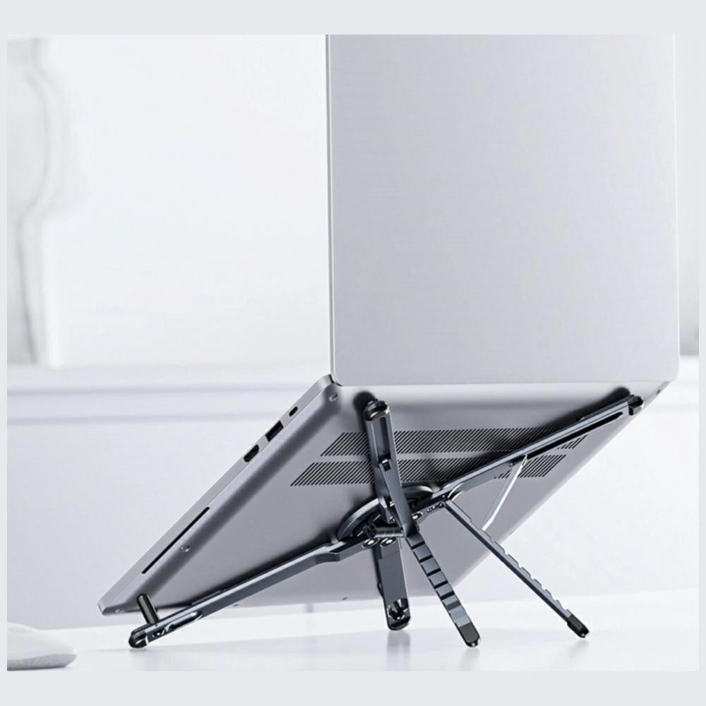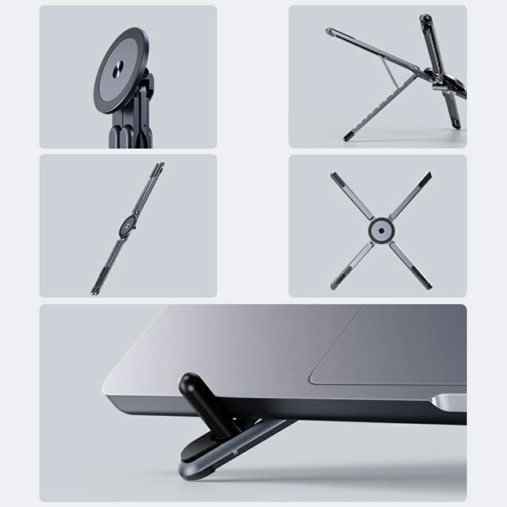 Smarte designelementer såsom skridsikre puder og ventilationsåbninger øger stabiliteten og hjælper luftstrømmen for bedre køling af den bærbare. Standeren kan lynhurtigt foldes sammen til et lille format, hvilket gør den ideel til rygsæk og taske.