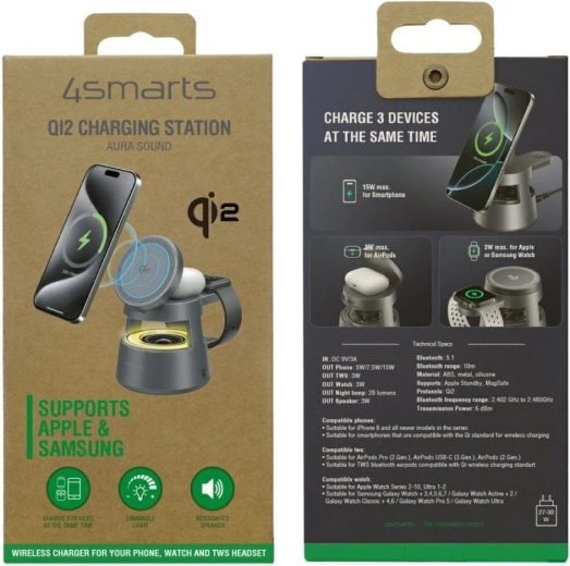 Den multifunktionelle opladningsstation 4smarts Aura Sound Qi2 i elegant grå gør det muligt at oplade telefon, høretelefoner og Apple- eller Samsung-ure samtidig. Takket være Qi2-standarden tilbyder den hurtig og stabil trådløs opladning, magnetisk fastgørelse for sikkerhed og bekvemmelighed samt integreret 3-trins LED-belysning og indbygget højttaler for maksimal komfort under arbejde og afslapning.