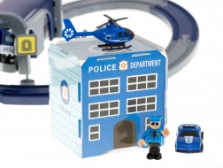 Politistation med helipad, 4 forskellige køretøjer, helikopter, politifigur og trafikskilte – alt til realistiske indsatser og læring af færdselsregler.