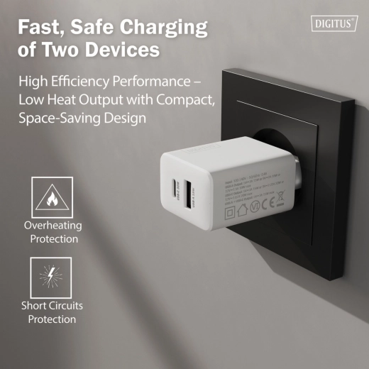 Kompakt USB‑oplader med GaN-teknologi leverer 30 W effekt til hurtig og pålidelig opladning. Med porte USB‑C (op til 30 W) og USB‑A (op til 18 W) kan den forsyne smartphones, tablets og lette bærbare. Ved samtidig brug af begge porte leverer den op til 15 W. Den moderne GaN II sikrer højere effektivitet, lavere varmeudvikling og mindre dimensioner – ideel til hjemmet, kontoret og på farten. Kabinettet er fremstillet af 98 % PCR‑plast, og plastikfri emballage glæder miljøbevidste brugere.