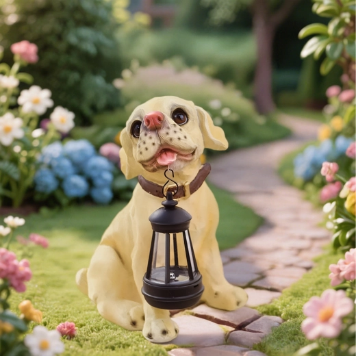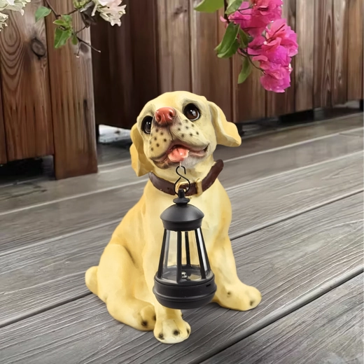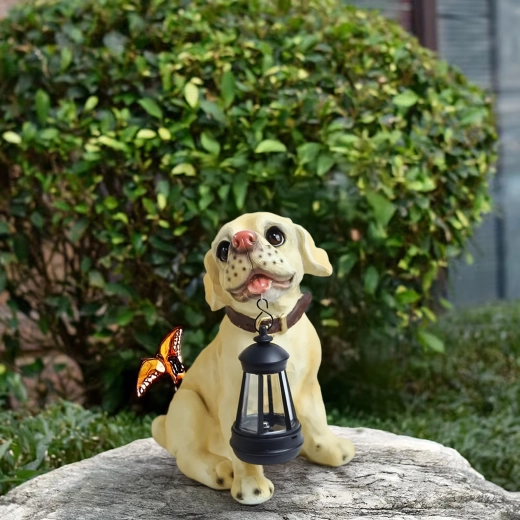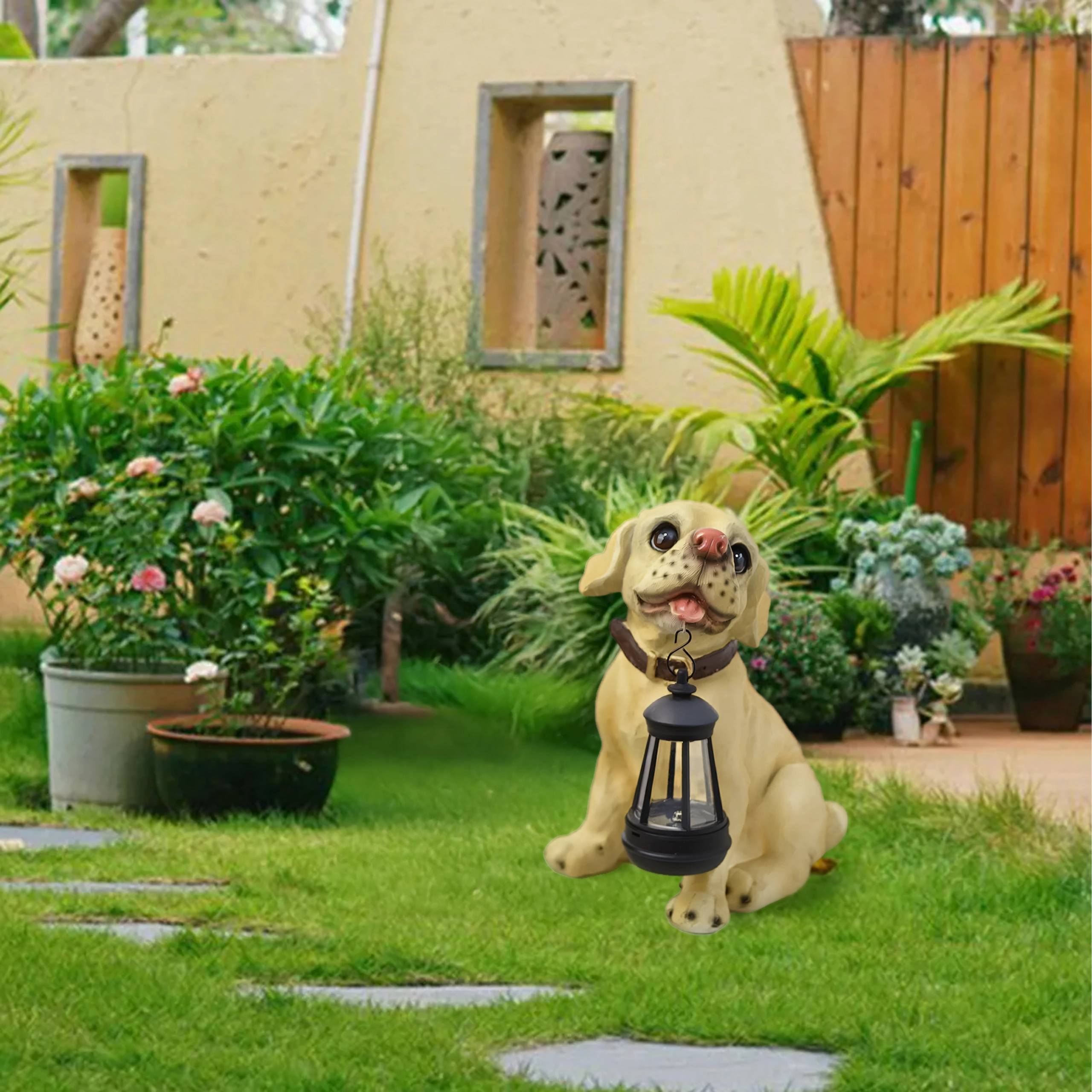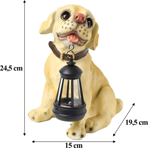 Den søde havedekoration i form af en hund med lanterne forvandler enhver sti eller bed til et hyggeligt sted. Den integrerede lanterne med LED-lys giver behageligt, varmt lys, figuren er vejrbestandig og passer perfekt til have, terrasse og altan.