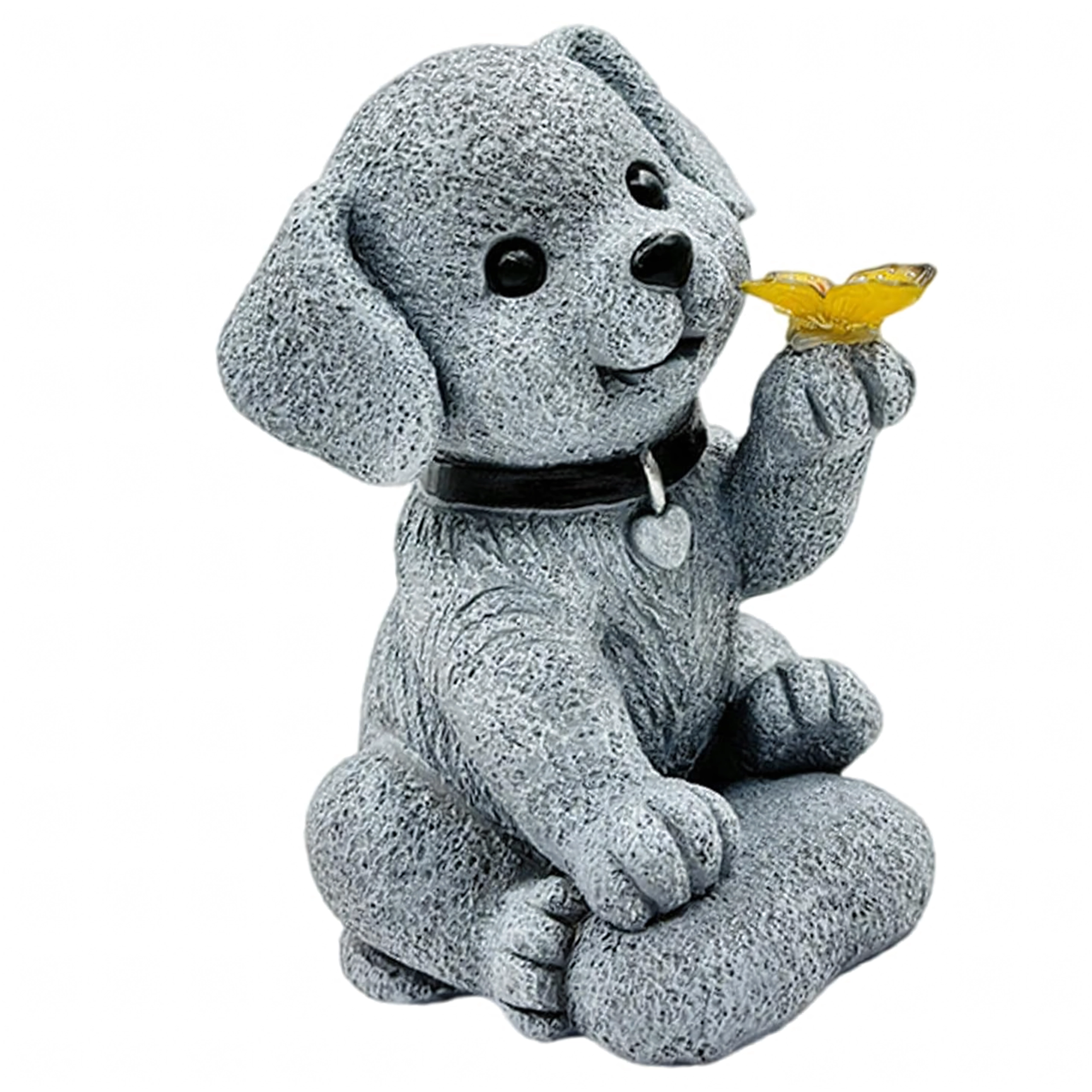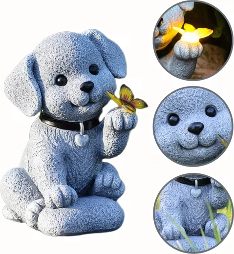 Denne stilfulde solcelle have-lampe hund med sommerfugl kombinerer dekorativ charme med praktisk belysning. Sommerfuglen i poten lyser med et behageligt, varmt lys efter skumring og skaber en hyggelig atmosfære i haven, ved indgangen, på terrassen eller på vindueskarmen.