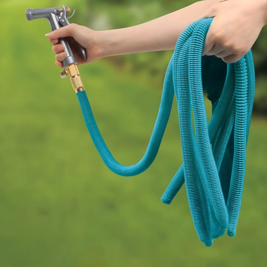 Slangen forlænger sig op til det tredobbelte ved vandtryk og trækker sig sammen til kompakt størrelse, når vandet lukkes. Den knækresistente fletning sikrer jævnt flow uden knuder.
