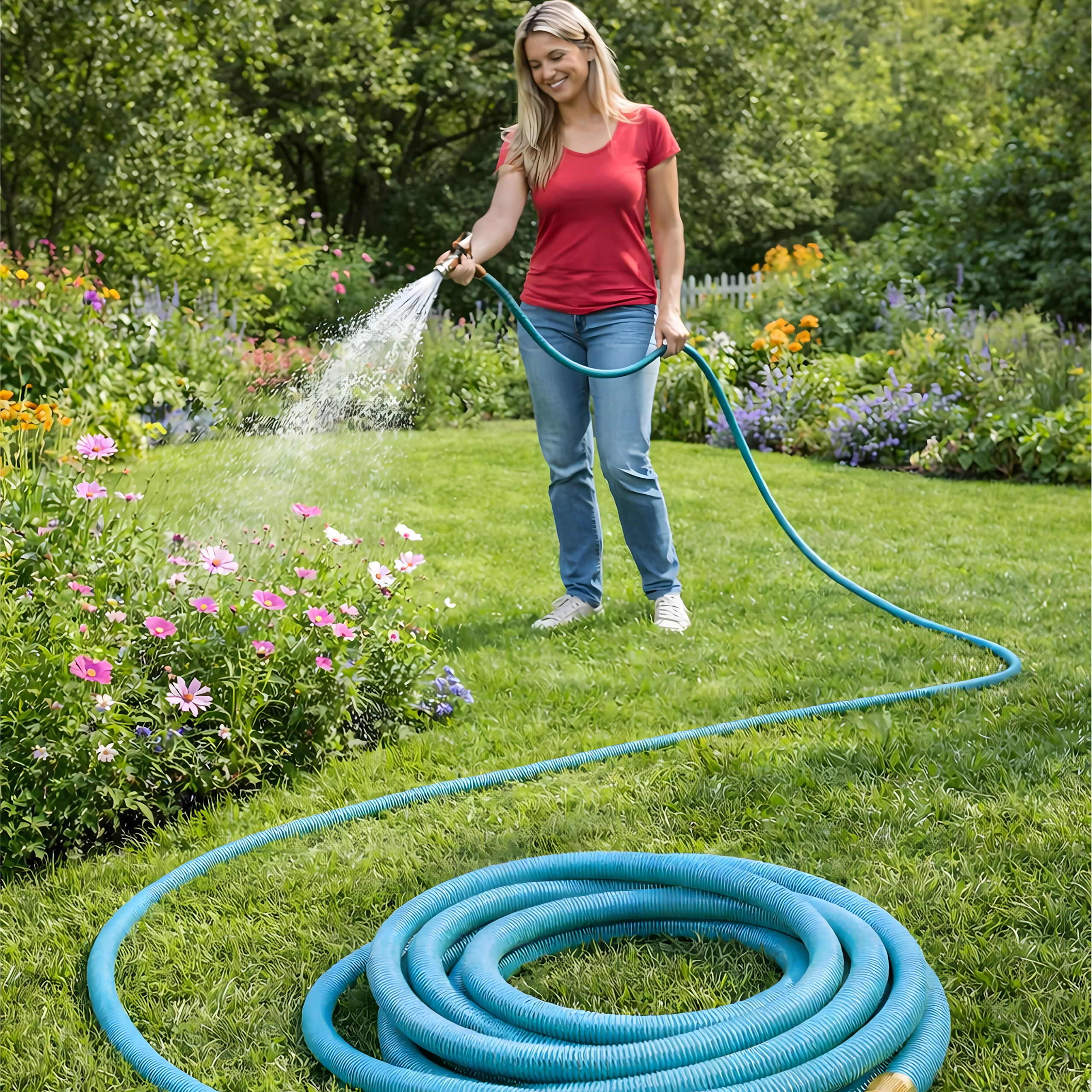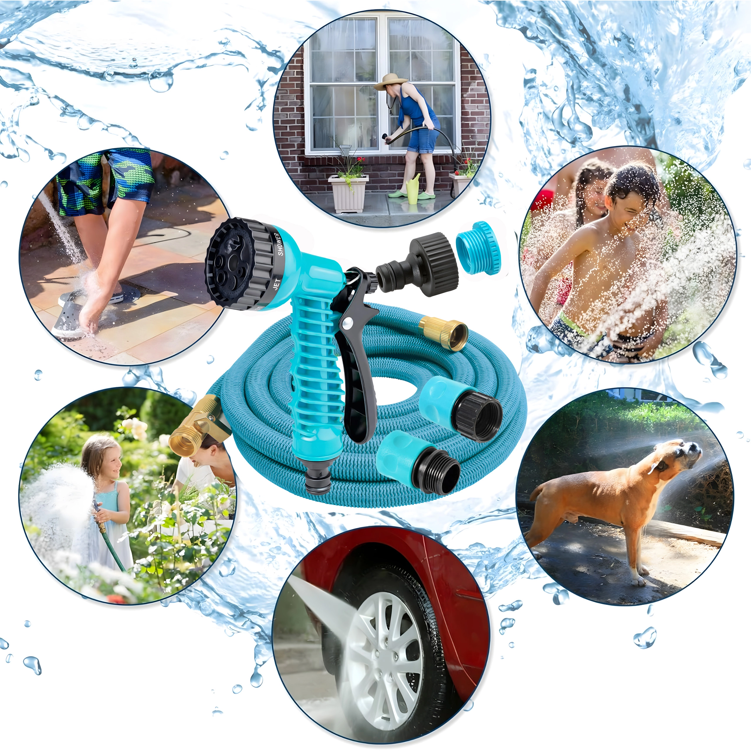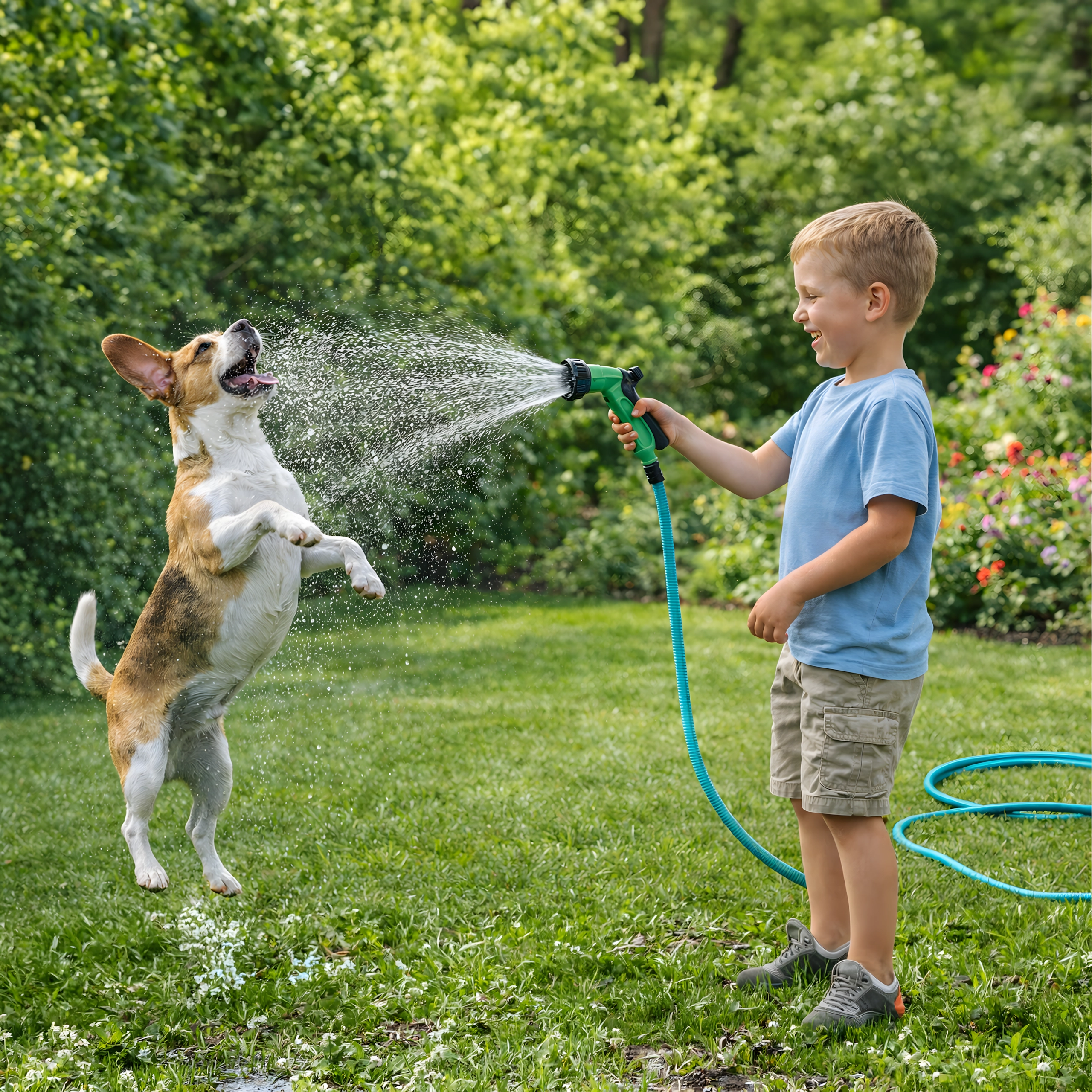 Der medfølger en multifunktionel sprøjtepistol med fin tåge, brusefunktion og kraftig stråle – ideel til bedvanding, bilvask eller afskylning af terrasser. Slangen er let, nem at bære og kan opbevares på holder eller i boks.