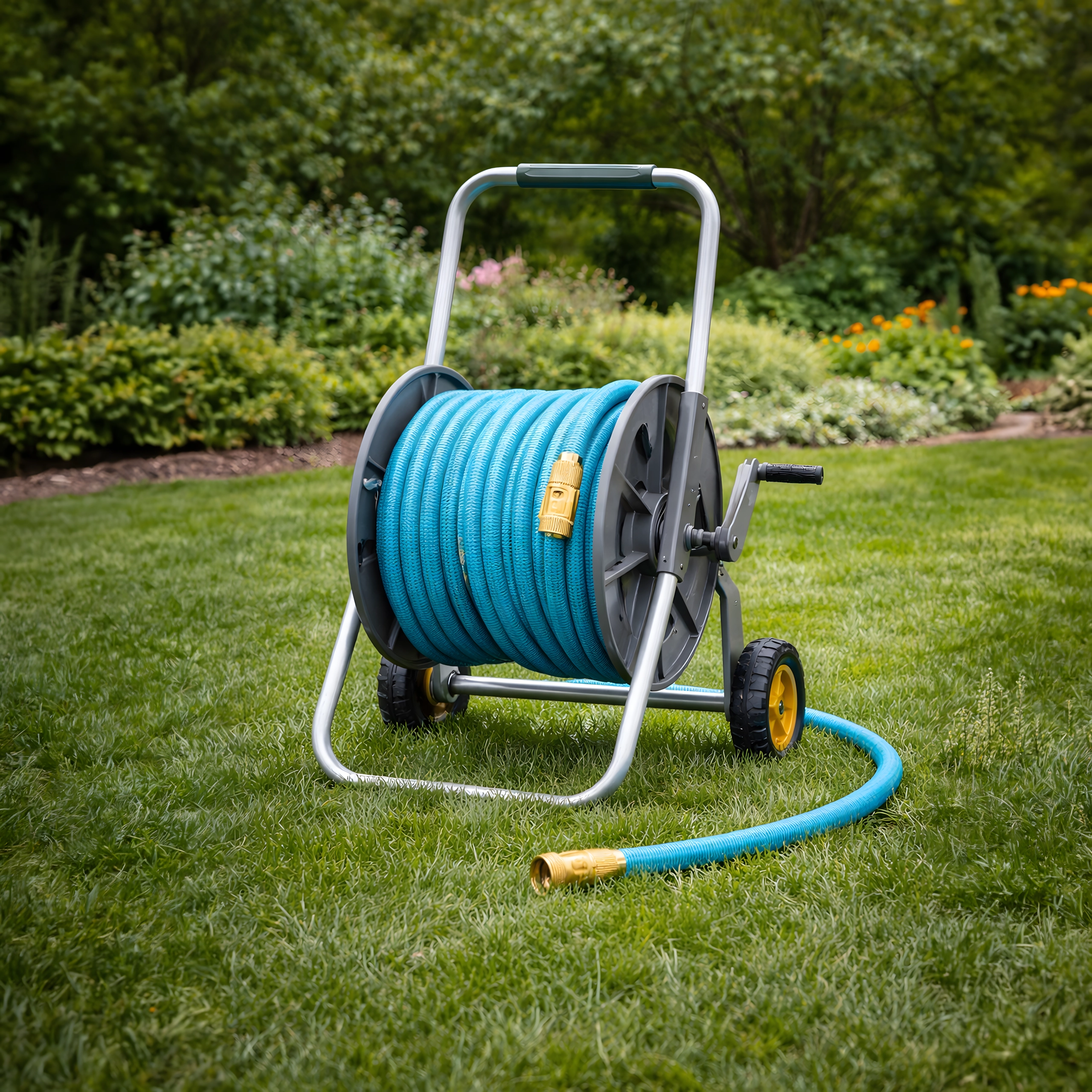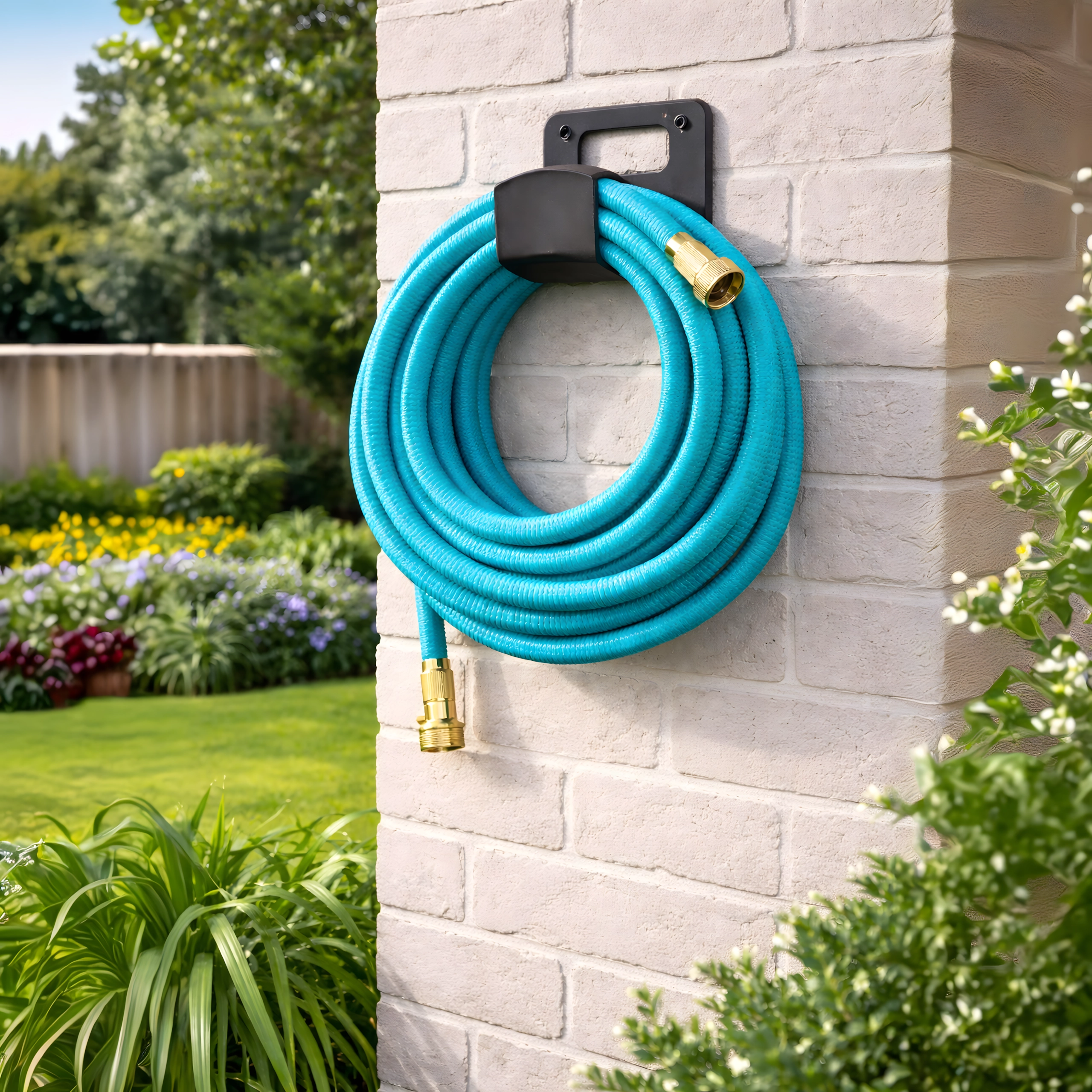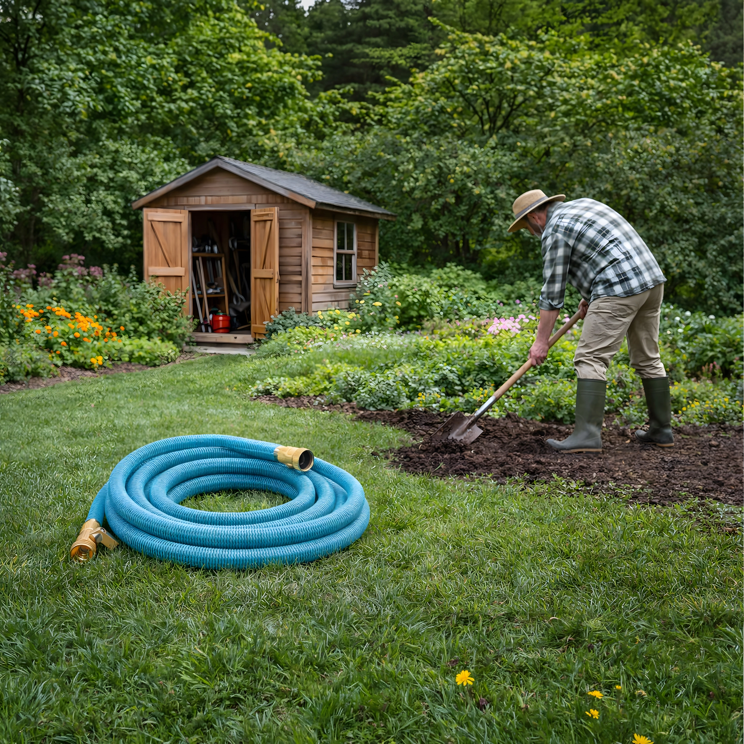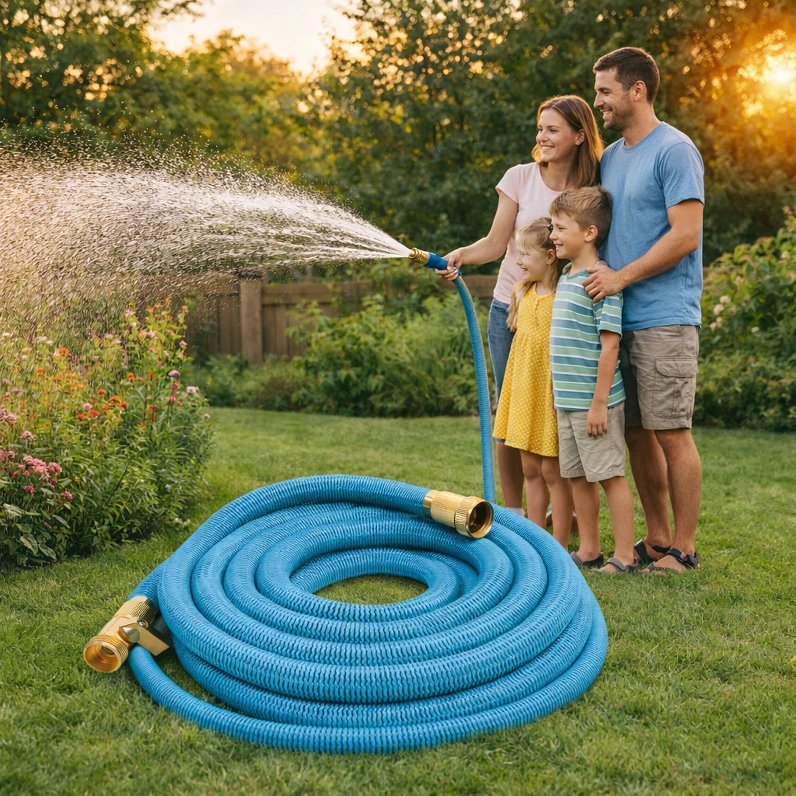 Der medfølger en multifunktionel sprøjtepistol med fin tåge, brusefunktion og kraftig stråle – ideel til bedvanding, bilvask eller afskylning af terrasser. Slangen er let, nem at bære og kan opbevares på holder eller i boks.