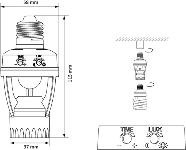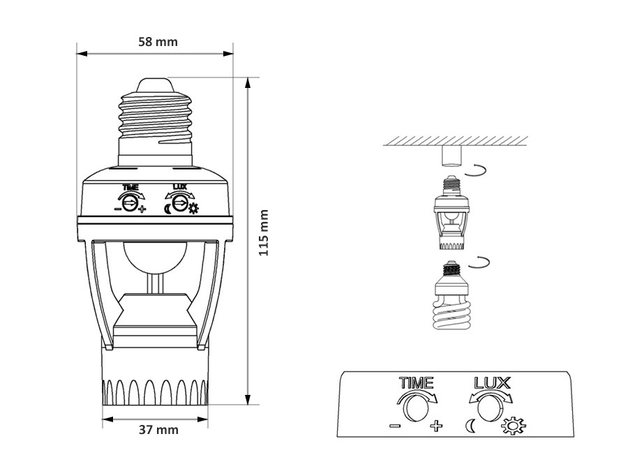 Installationen tager få minutter: Skru blot i den eksisterende E27-fatning og indsæt pæren. Med de drejelige regulatorer indstiller du nemt efterløbstid (TIME) og tærskel for belysning (LUX). Sensoren bruger infrarød detektion (PIR) og genkender pålideligt dag/nat, hvilket sparer energi og omkostninger.