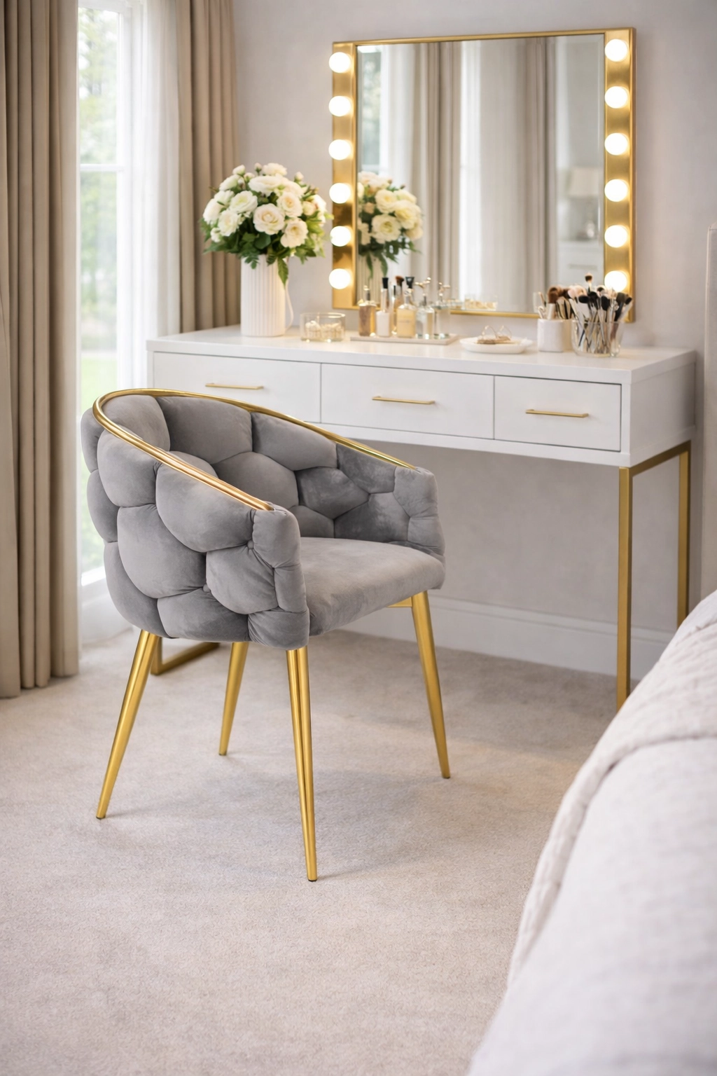 - Stil og holdbarhed: velour med let glans, metalben med guldfarvet overflade