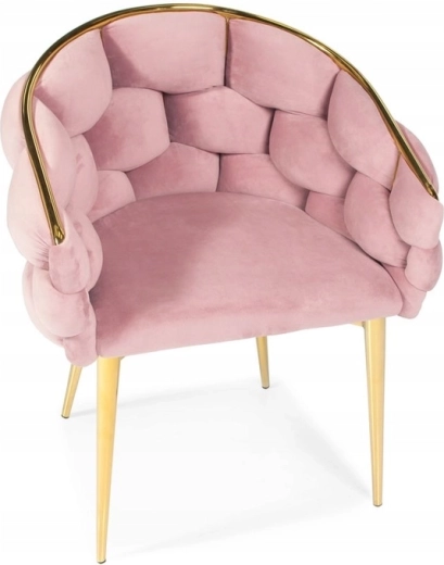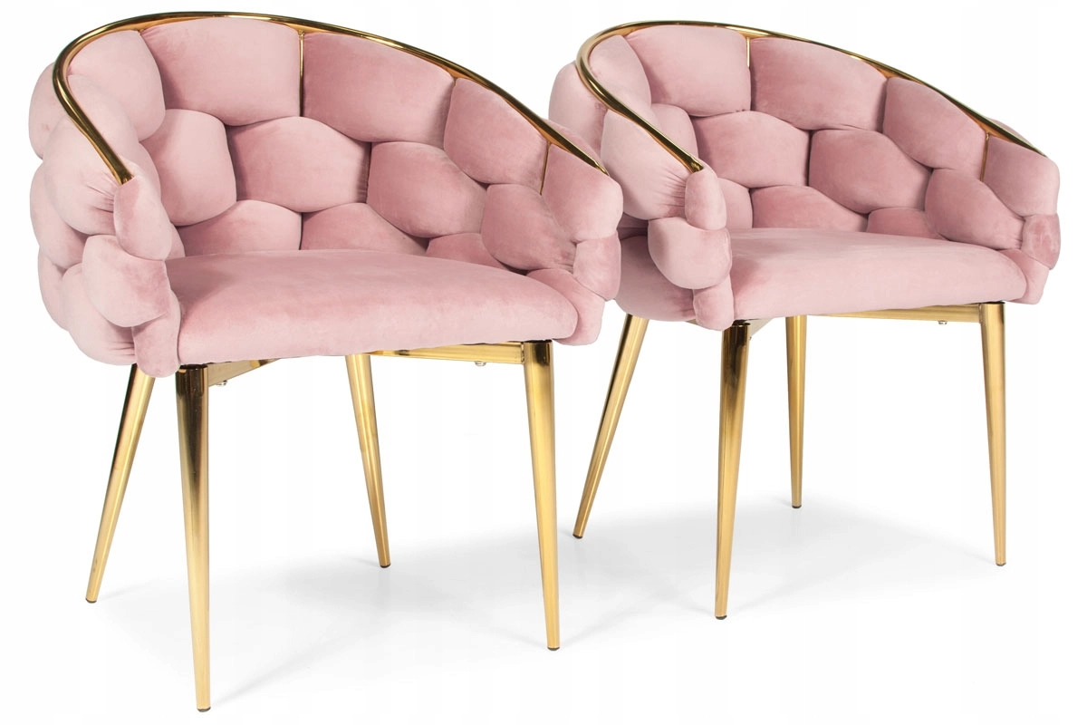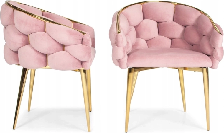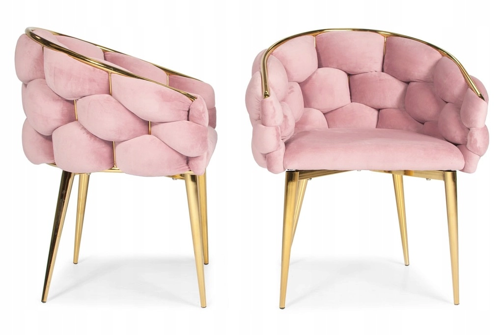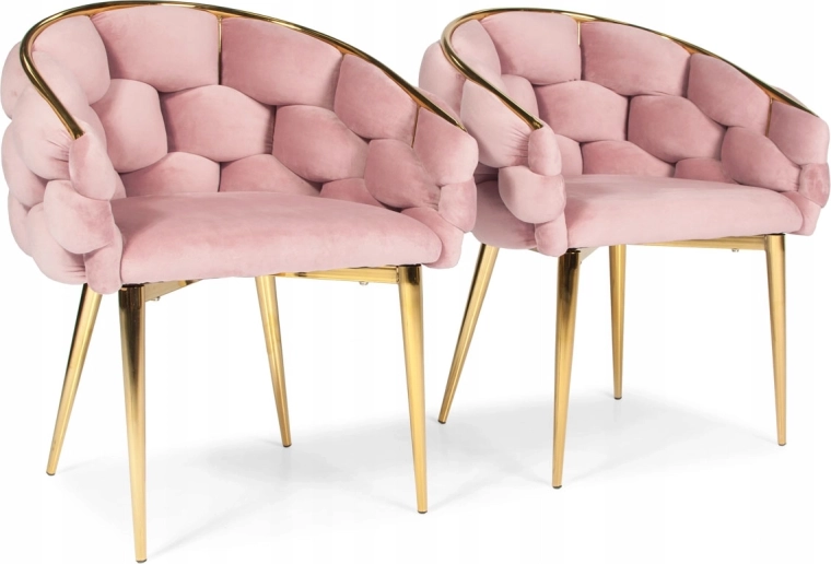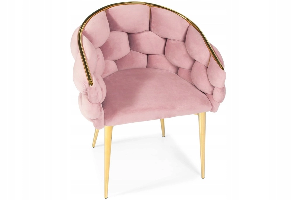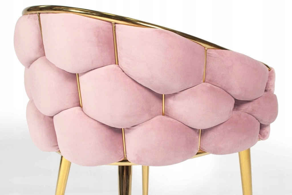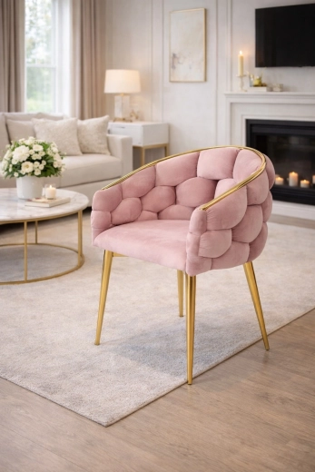 Elegant stol i glam-stil med rosa velour og gyldne metalben tilbyder komfortabel bucket-sædekomfort med støtte til ryggen. Det bløde velourpolster med let glans giver interiøret et eksklusivt præg, mens den robuste stålkonstruktion sikrer stabilitet til daglig brug – ideel til spisestuen, stuen eller ved sminkebordet.