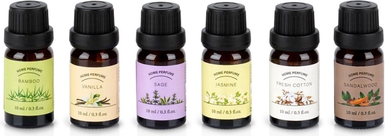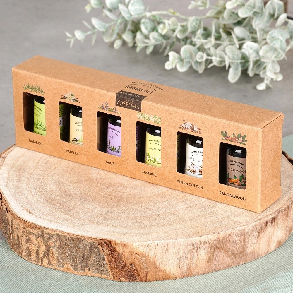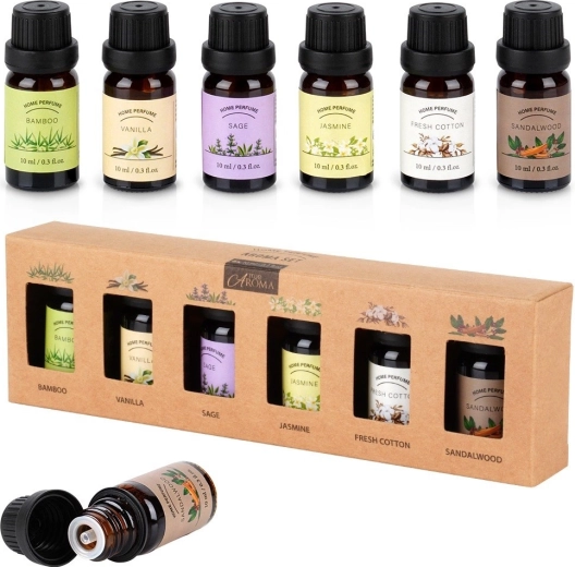 Dette elegante sæt æteriske olier bringer seks populære dufte til hjemme-aromaterapi. Dryp blot et par dråber i en diffusor, aromalampe eller på en keramisk plade, og dit rum fyldes med en langvarig duft, der fremmer ro, fokus og velvære. Hver flaske er af glas (ca. 2,5 × 6 cm) og indeholder 10 ml kvalitetsduftolie.