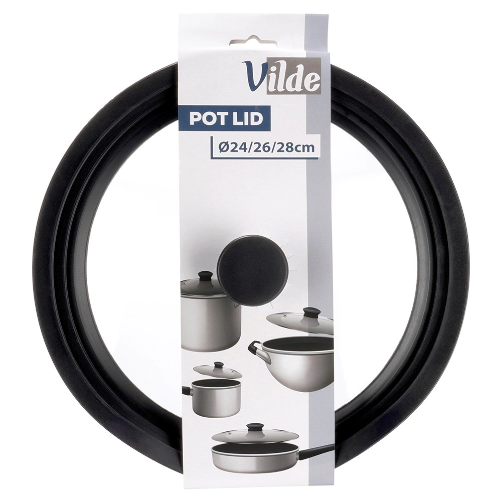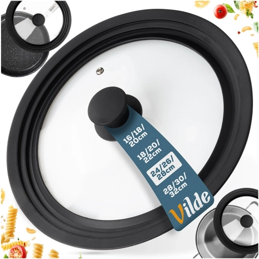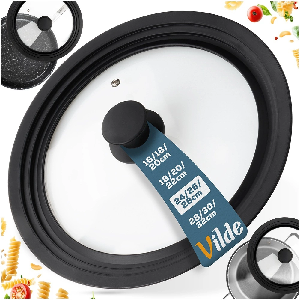 Praktisk universallåg 3-i-1 til gryder og pander med diameter 24, 26 og 28 cm sparer plads i køkkenet og sikrer perfekt tætning. Den brede silikonekant beskytter kanten på kogegrejet, det gennemsigtige hærdede glas gør det muligt at holde øje med madlavningen, og den integrerede dampventil forhindrer overkog. Tåler opvaskemaskine, varmeresistent og udstyret med ergonomisk håndtag. Originalt produkt fra VILDE.