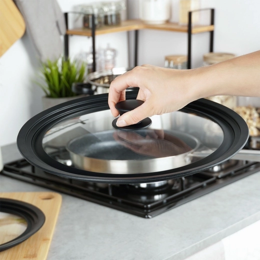 Den universelle silikonekant tilpasser sig tre grydediametre, så du kan erstatte tre separate låg og spare plads i dit køkken.