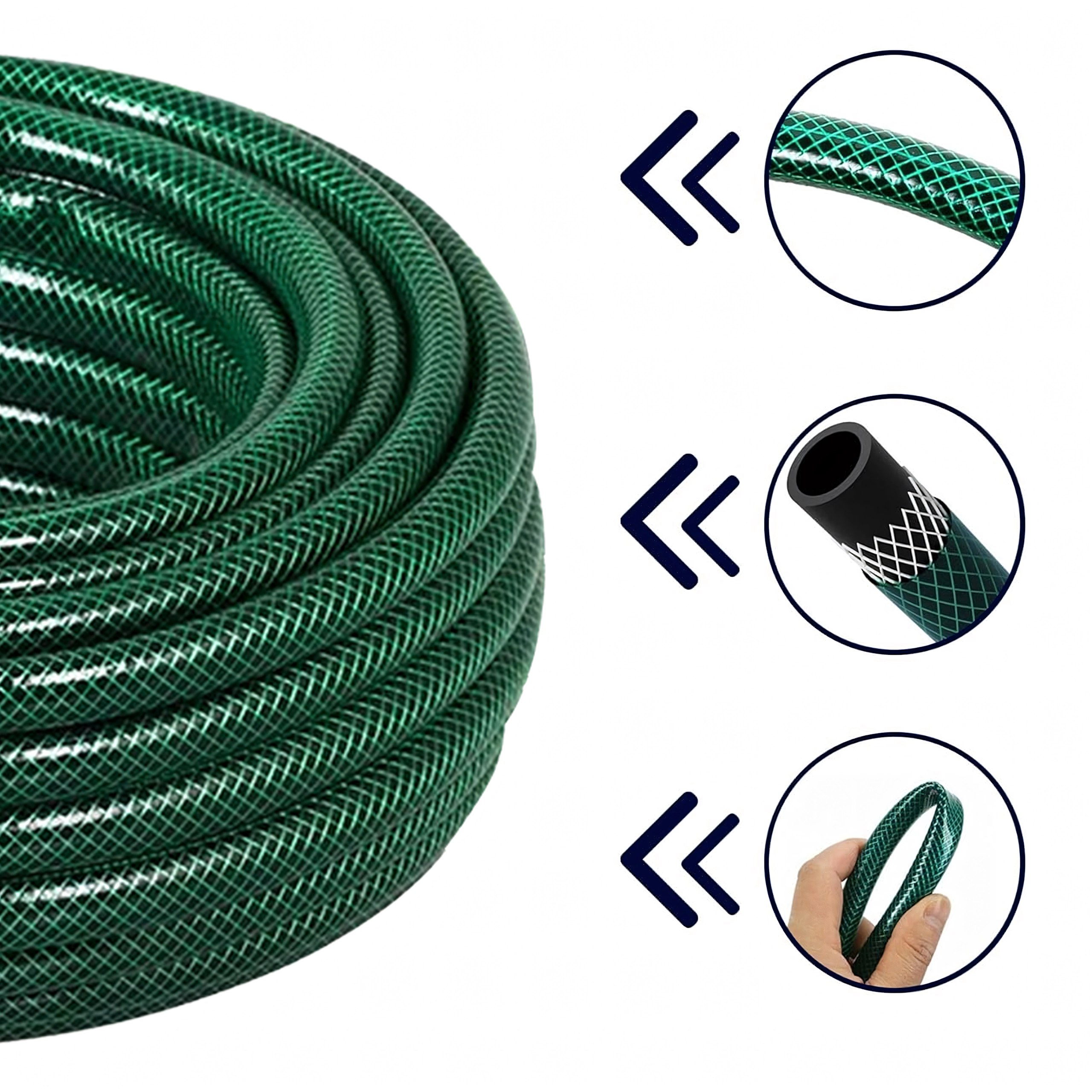 Kombinationen af indre gummislange, forstærkende net og en robust yderskal sikrer styrke, trykbestandighed og pålidelig gennemstrømning uden sprængning.