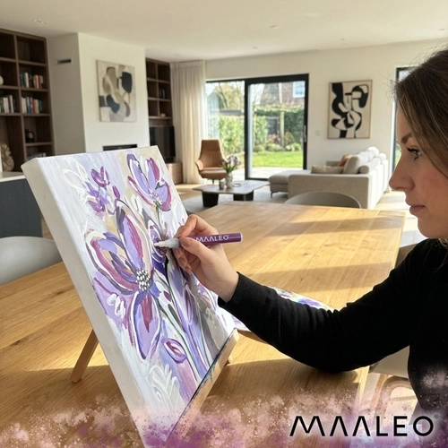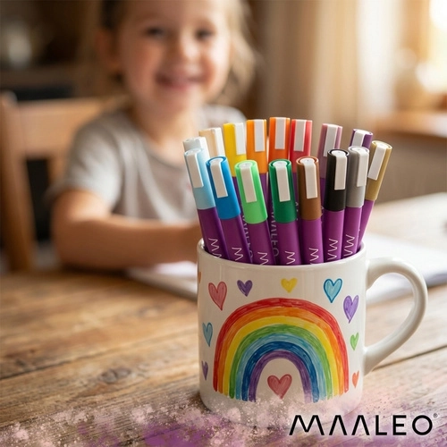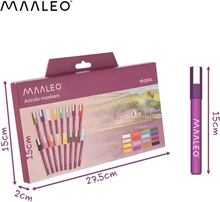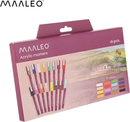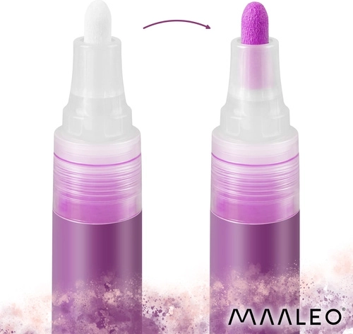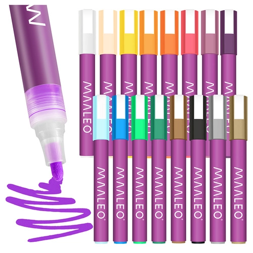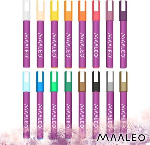 MAALEO akrylmarkere giver male-komfort uden pensler: indeni er akrylmaling, ikke vandbaseret blæk. Det giver mættede, uigennemsigtige strøg, som hæfter godt på forskellige materialer og ikke bløder igennem tyndere papir. Hver marker indeholder 8 ml maling for lang holdbarhed og konsistente resultater.