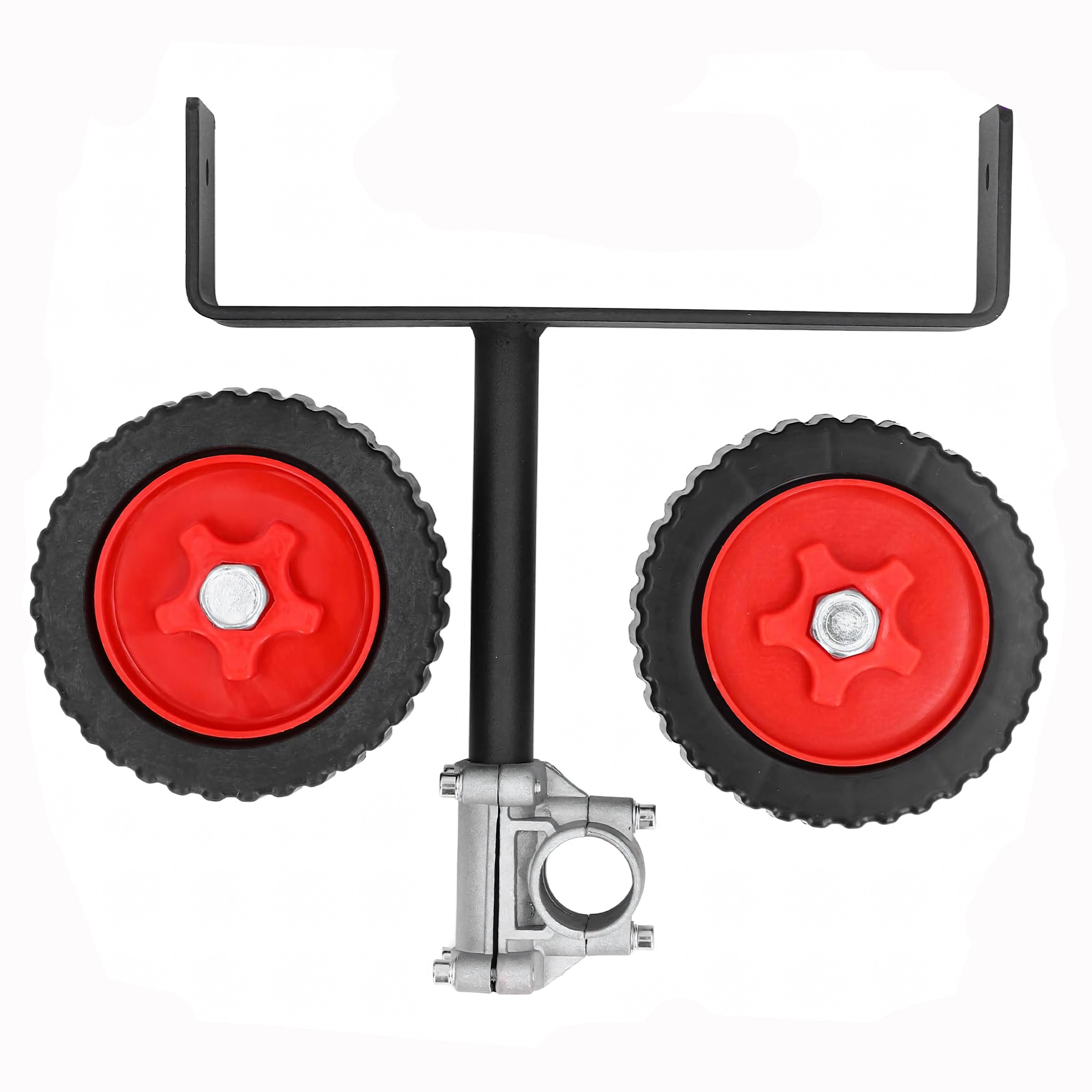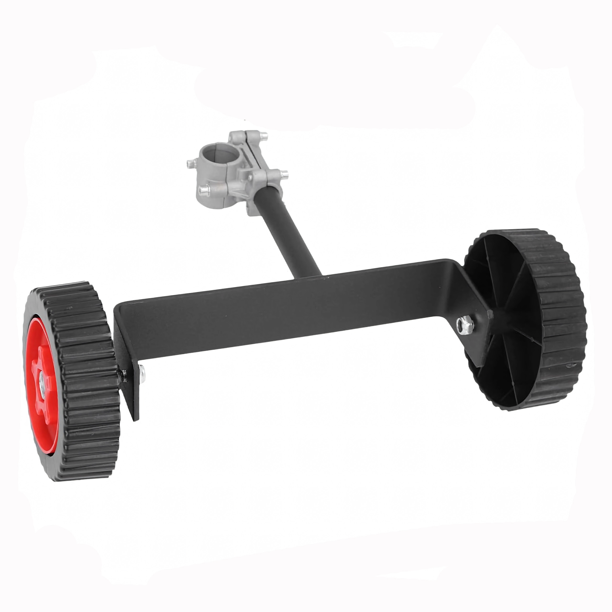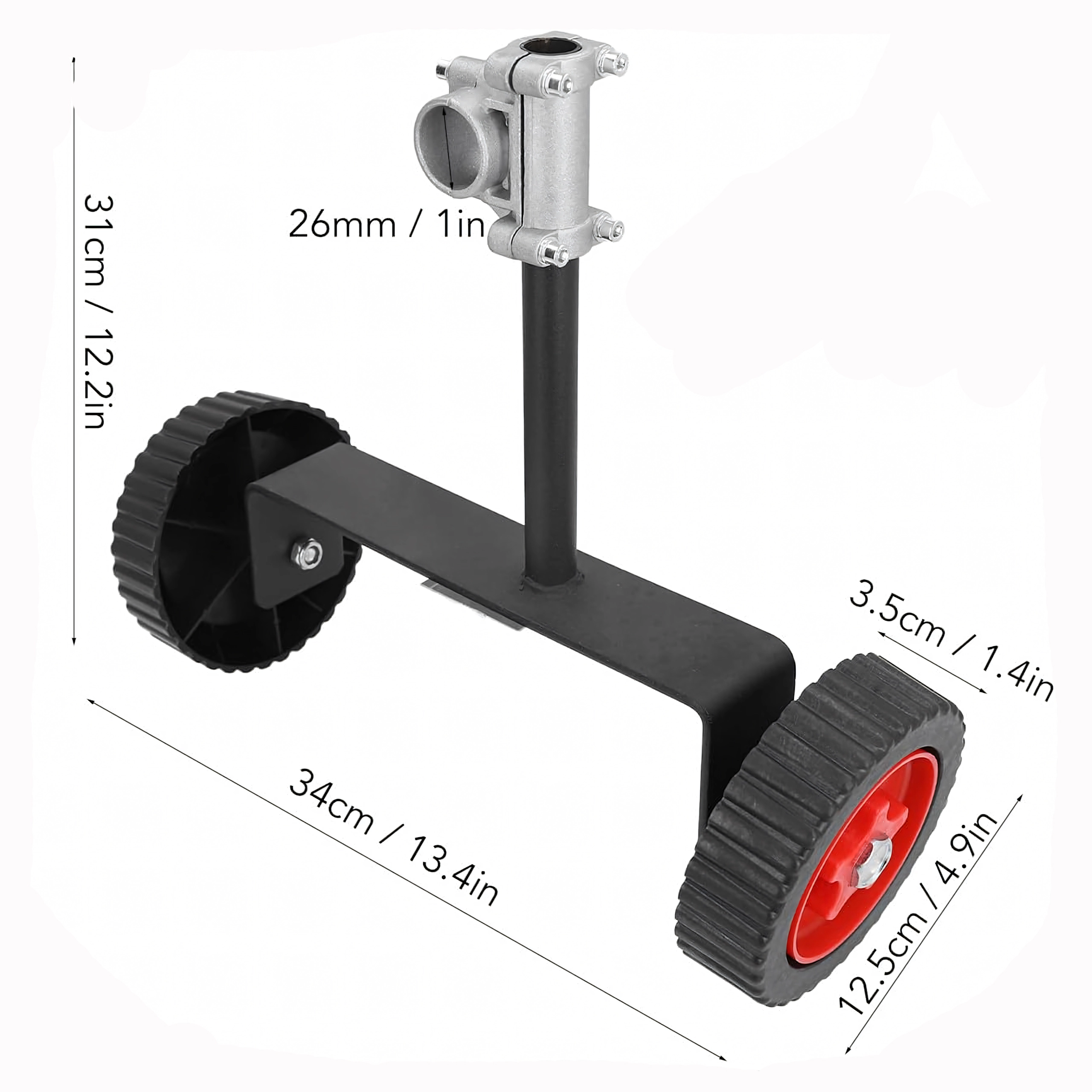 Det kraftige metalbeslag med justerbar klemme til rørdiameter 26–28 mm og det dobbelte sæt slidstærke hjul med markant dækmønster sikrer stabilitet på forskellige underlag. Monteringen er hurtig og kræver ikke specialværktøj – klem blot beslaget på røret og indstil den ideelle vinkel.
