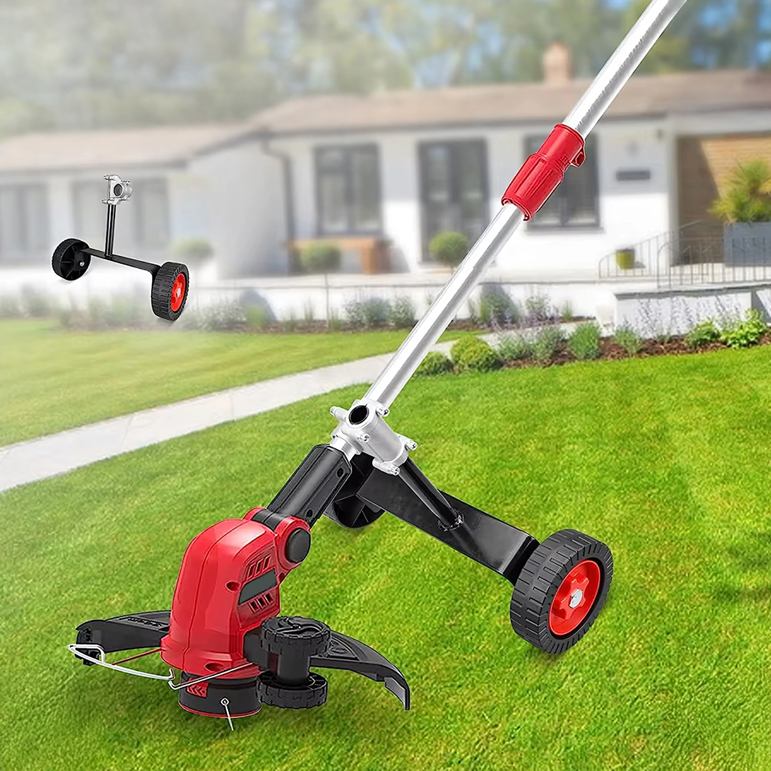 To robuste hjul støtter trimmeren og hjælper med at føre klippet præcist langs kanter og bede uden at “skære ind” i græsplænen.