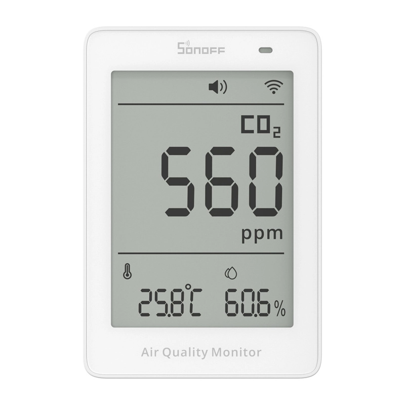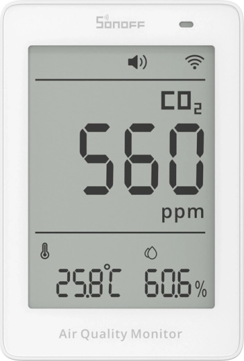 Den kompakte luftkvalitetsmonitor Sonoff AirGuard CO2 med en præcis NDIR‑sensor måler i realtid CO₂, temperatur og luftfugtighed. Den tilbyder 3,73" LCD‑display, Wi‑Fi 2,4 GHz, support for Matter, lyd- og lysalarmer samt målehistorik, så du har overblik over miljøet derhjemme, på kontoret og i børneværelset.