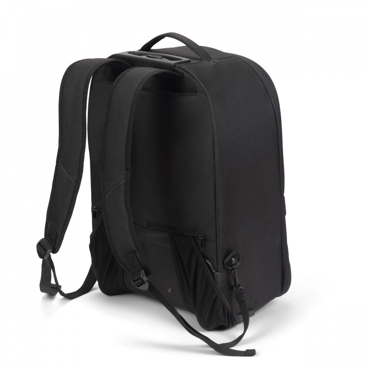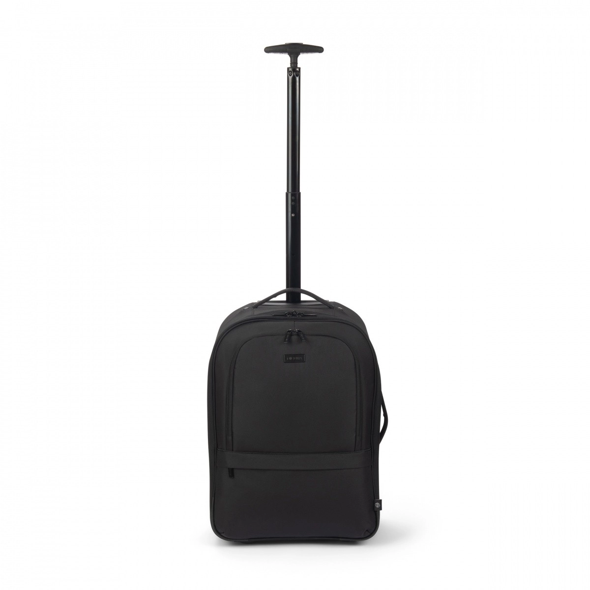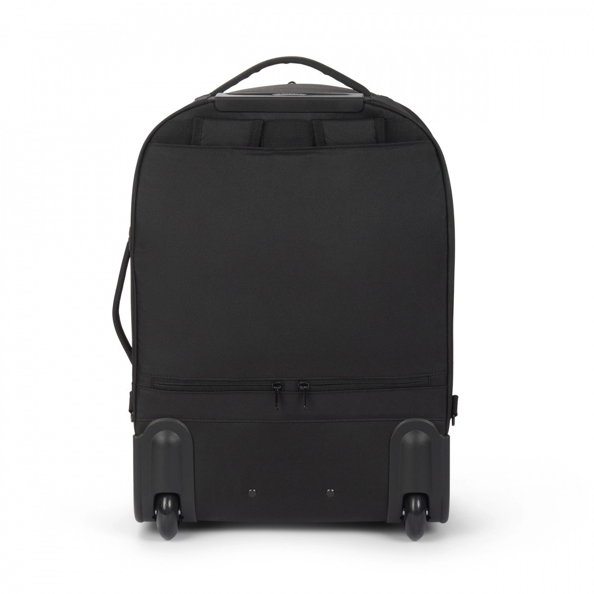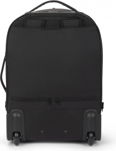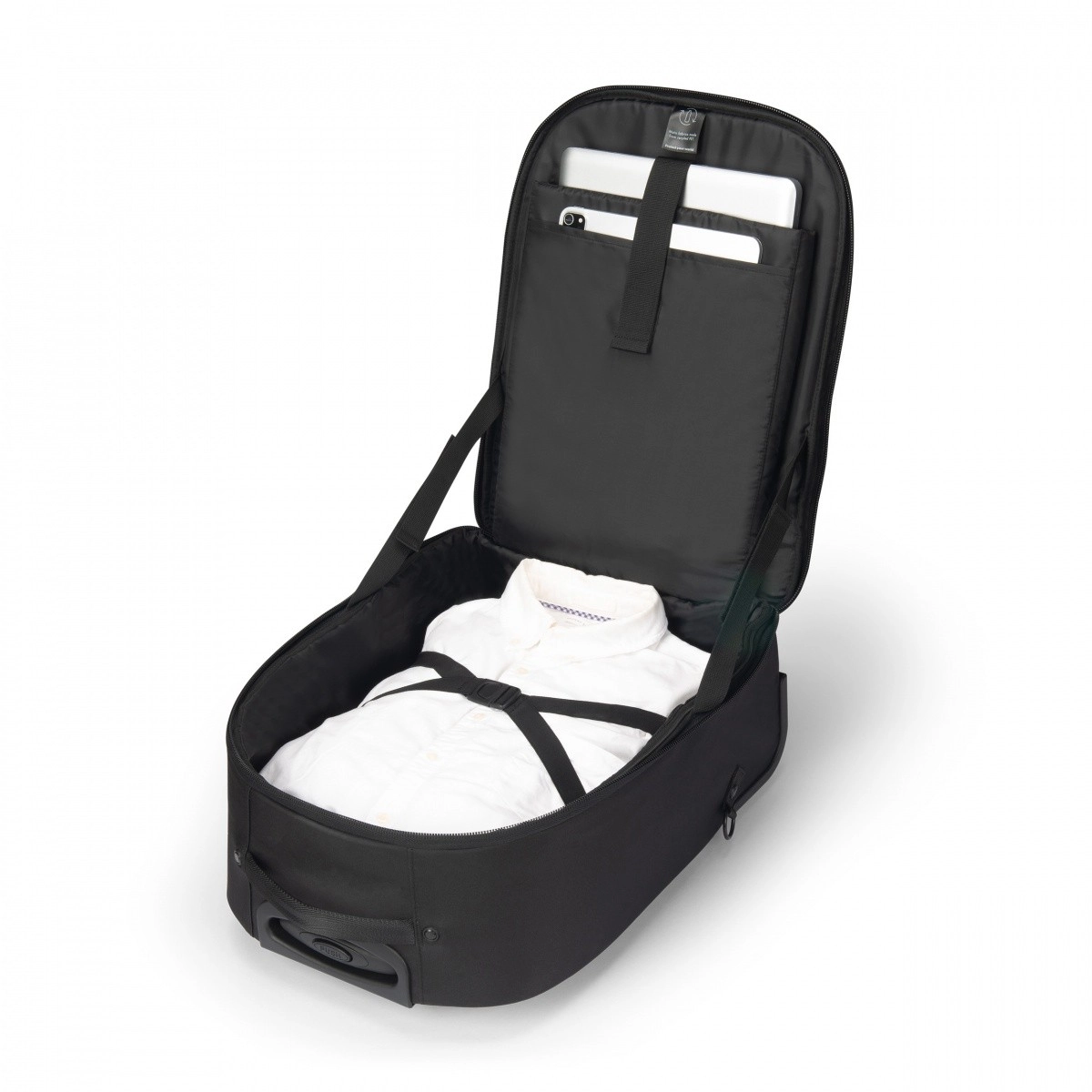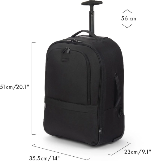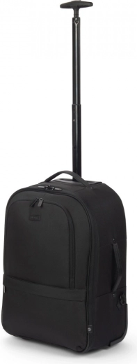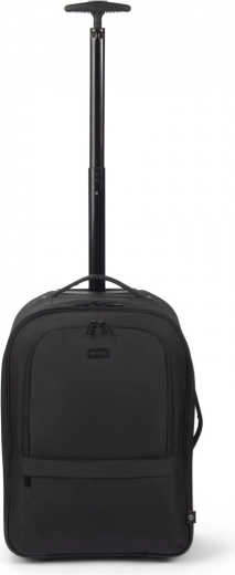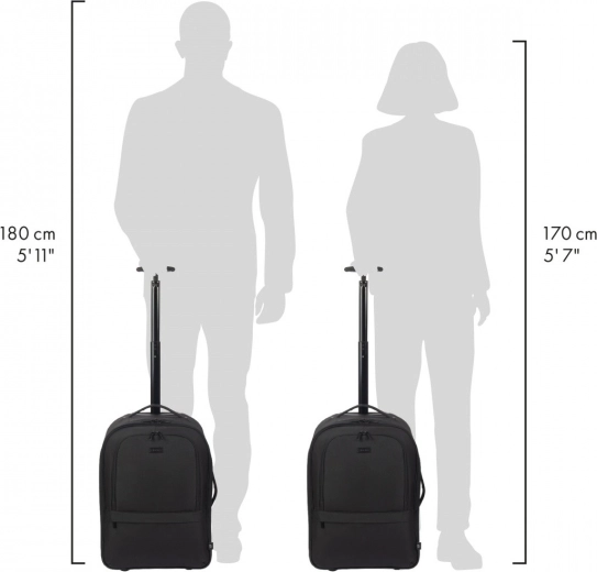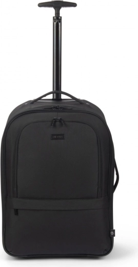 Teleskophåndtag, slidstærke hjul samt side- og top-håndtag gør transporten let. Skjulte stropper muliggør hurtig skift fra rygsæk til trolley.