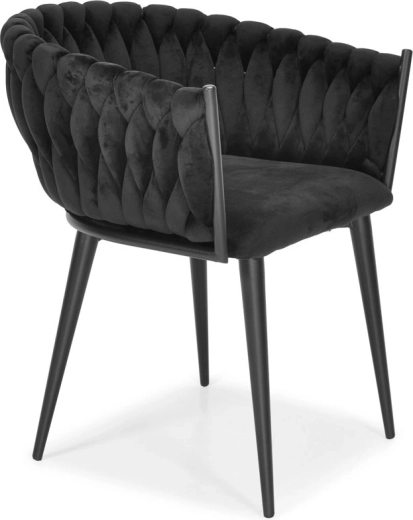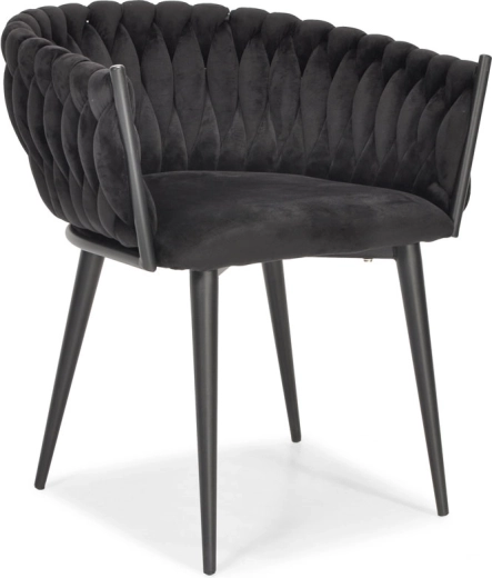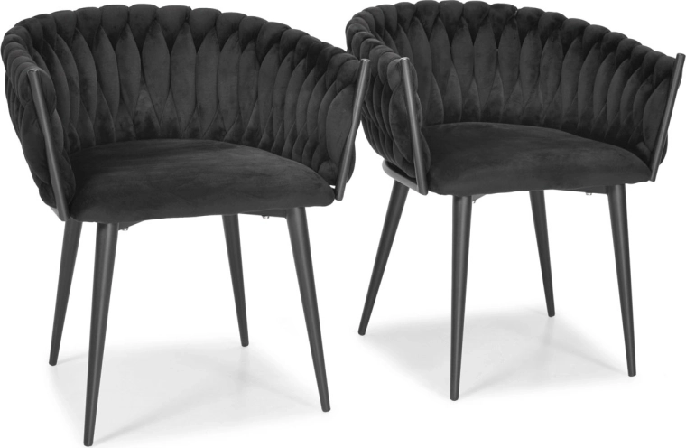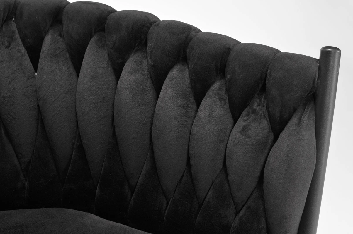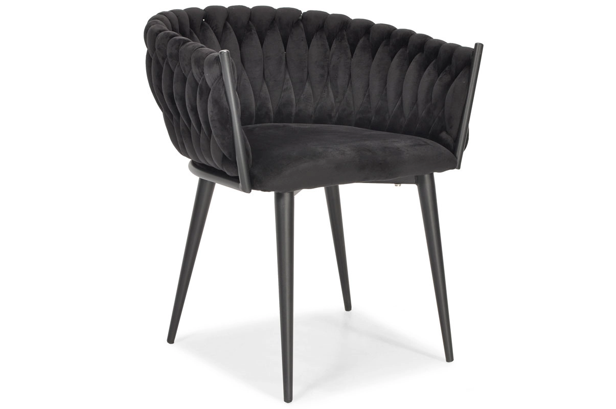 Den elegante ROSA-lænestol i dyb sort forener luksuriøs velour, et dekorativt strikket ryglæn og slanke, stabile ben til et stilfuldt statement til stue, spisestue og beauty-hjørne. Den tilbyder behagelig polstret siddekomfort og giver straks indretningen et glamourøst look og et premiumudtryk.