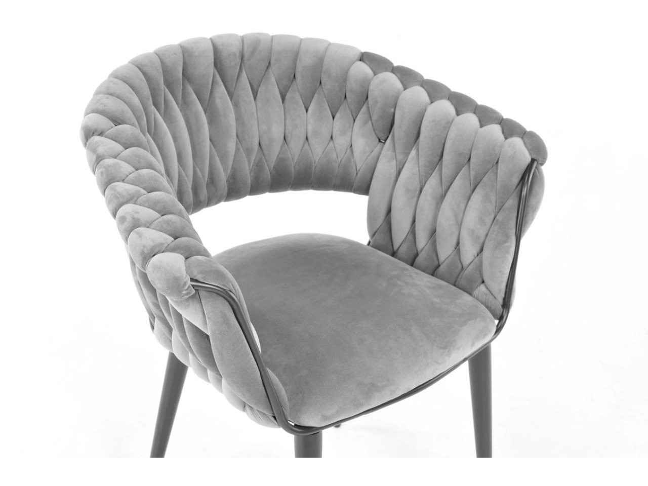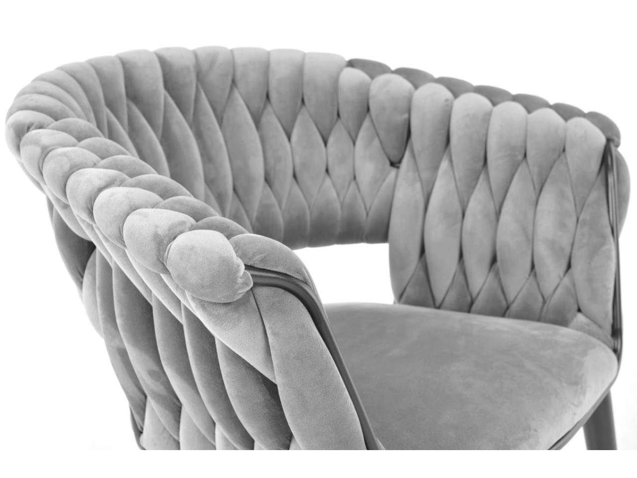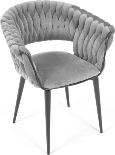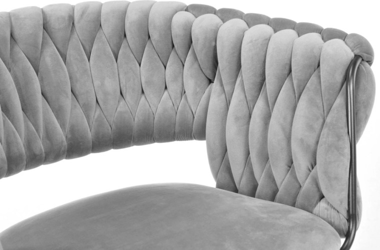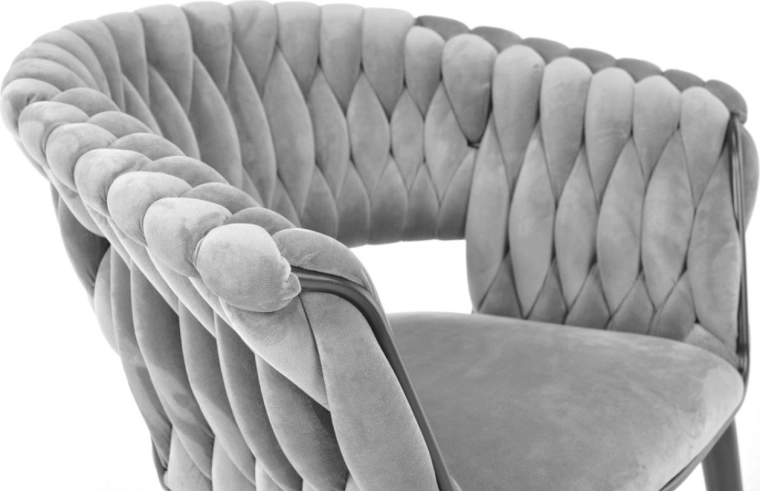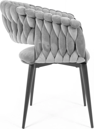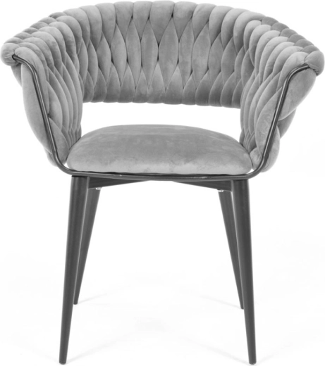 Skab en hyggelig krog derhjemme med et strejf af luksus. Den grå fløjl med diskret glans virker eksklusiv, reflekterer lyset behageligt og danner sammen med de sorte ben en tidløs, moderne kontrast. Det karakteristiske flettede polstrede ryglæn giver stolen et designpræg og samtidig en behagelig støtte.
