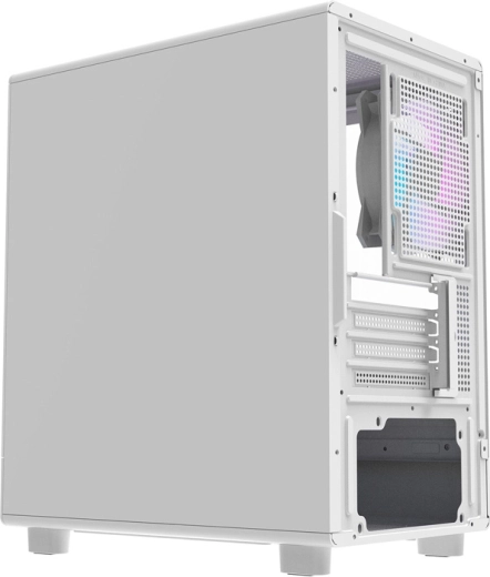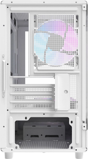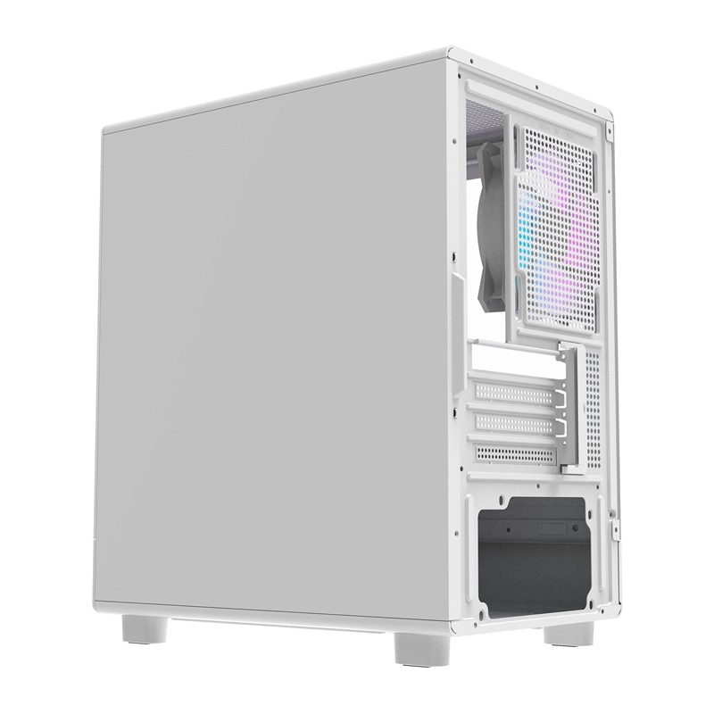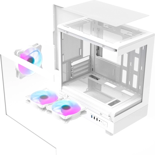Det minimalistiske look i hvidt suppleres af let aftagelige sidepaneler uden værktøj og smarte gennemføringer for ren kabelhåndtering. Foretrækker du vandkøling, understøtter kabinettet en 240 mm radiator i toppen og 120 mm på siden/bagpå afhængigt af konfiguration.