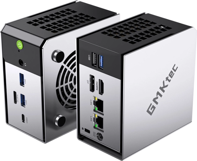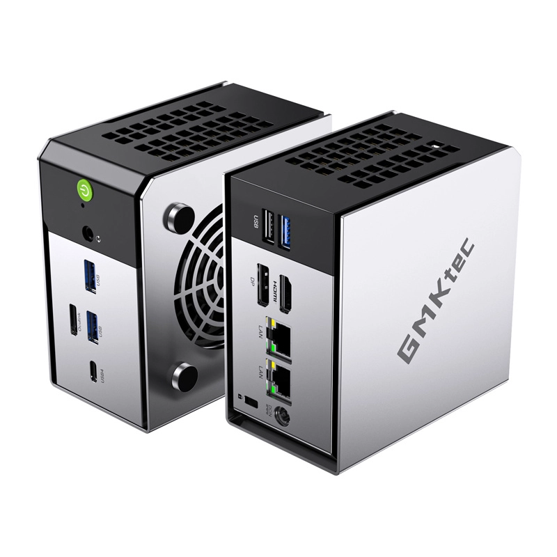 - Porte til alt: 3× USB‑A 3.2 Gen2, 1× USB‑A 2.0, 1× USB4 (PD/DP/40 Gb/s), 1× HDMI 2.0, 1× DP 1.4, 1× OCuLink (PCIe Gen4 x4) til eGPU, 2× RJ45 2,5G, 3,5 mm audio