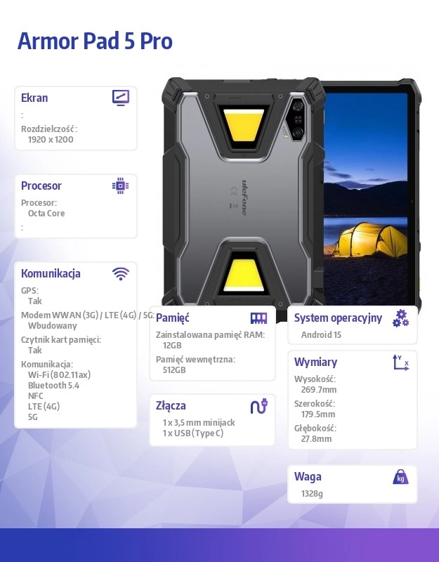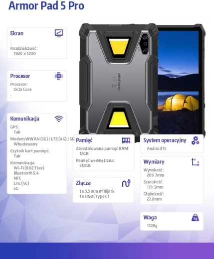 Ulefone Armor Pad 5 Pro er designet til brugere, der har brug for en tablet, de kan stole på i enhver situation. Den robuste konstruktion med gummierede hjørner, forstærkede kanter og forseglede porte beskytter enheden mod stød, støv og vand. Takket være 5G forbliver du online selv i felten, og den store 11" skærm giver komfort til arbejde, navigation og multimedier.
