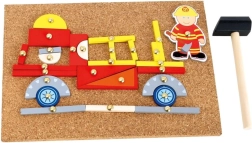 Farvede træformer og billeder på korkpladen støtter fantasien og gør det muligt at samle brandbiler, stationer og hele scener.