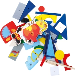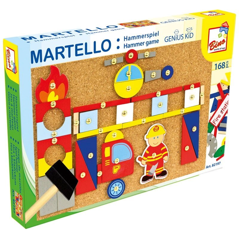Pakken indeholder en hammer, små søm og trædele i forskellige former og farver – i alt 168 stk. Delene kan nemt fjernes og samles igen når som helst, så legen fremmer tålmodighed, logisk tænkning og kreative løsninger. Den høje kvalitet fra BINO sikrer holdbarhed og sikkerhed under legen.