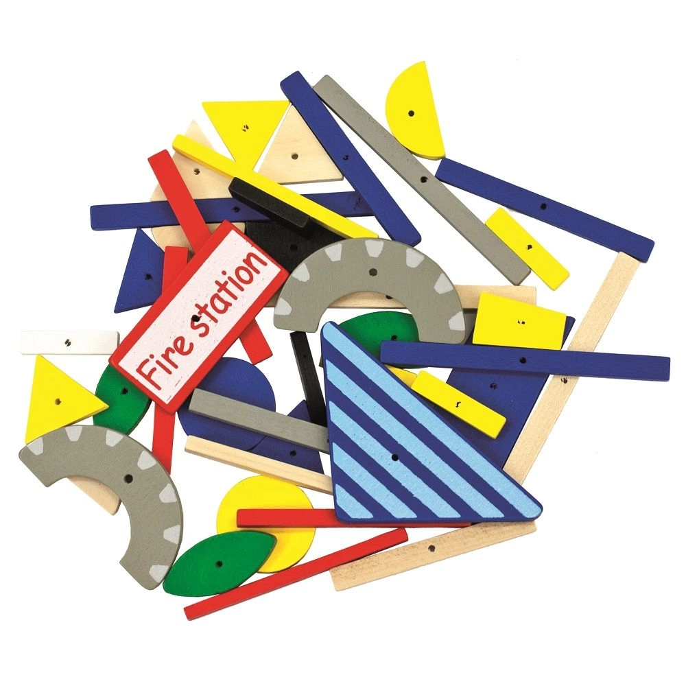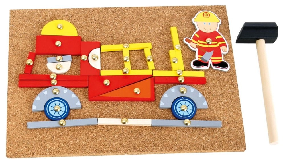 Dette kreative byggesæt med brandmandstema begejstrer alle små byggere. Med det store udvalg af farvede træformer kan børn skabe brandbiler, stationer og deres egne historier. Den enkle fastgørelse på korkpladen er intuitiv og sikker, og udvikler samtidig finmotorik og øje–hånd-koordination på bedste vis.