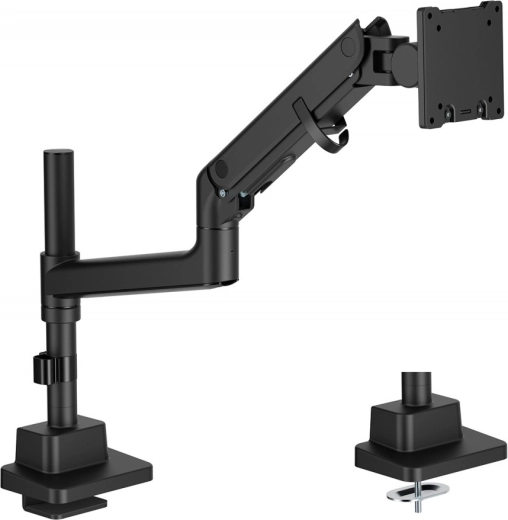 Professionel enkeltarms skærmholder med gasfjeder til skærme op til 57" og en bæreevne på 27 kg. Tilbyder præcis højdejustering, tilt og rotation, hurtigmontering med VESA Quick‑Release og integreret kabelhåndtering for en ren og ergonomisk arbejdsplads. Montering med klemme eller gennemføring i bordpladen.