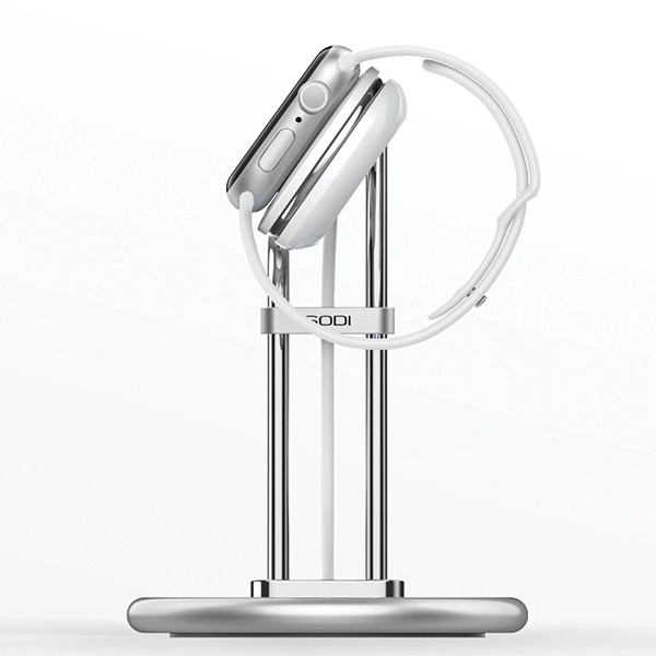 Det massive metalkabinet med vægtet bund holder uret sikkert på plads. Minimalistiske, polerede rør og et præcist udskåret hul til opladningsmodulet sikrer sikker og samtidig elegant opladning.
