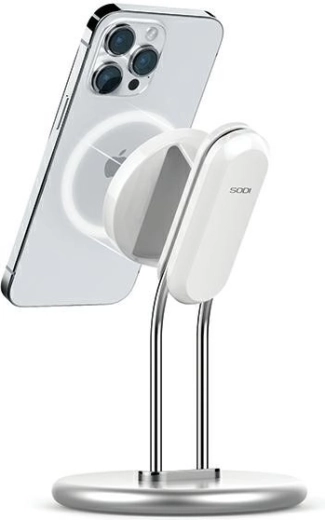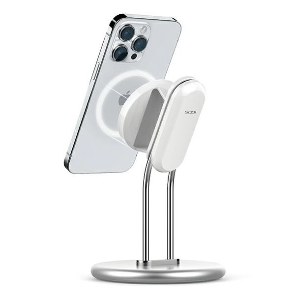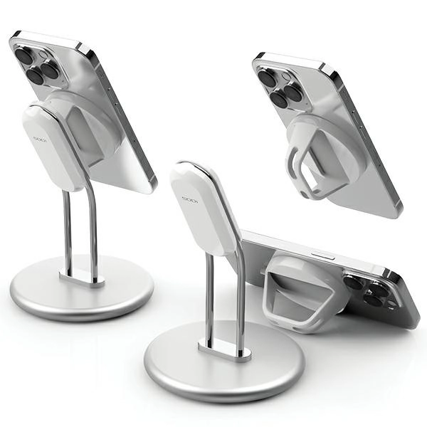 Elegant magnetisk holder i aluminiumslegering med aftagelig modul giver stabilt greb, MagSafe‑kompatibilitet og behagelig hands‑free visning af videoer, spil og videoopkald. Bløde silikonepuder beskytter bordet, den justerbare vinkel sikrer fremragende betragtningsvinkler, og den udskiftelige magnetplade gør det muligt at indsætte den originale trådløse MagSafe‑oplader (ikke inkluderet).