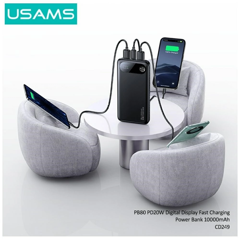 Leder du efter en let og kraftig powerbank, der holder dine enheder kørende hele dagen? USAMS PB80 leverer en kapacitet på 10.000 mAh og understøtter Power Delivery 20 W til lynhurtig opladning af kompatible telefoner og tilbehør. Takket være USB‑C og 2× USB‑A kan du nemt oplade flere enheder samtidigt – fra smartphone over hovedtelefoner til smartwatch.